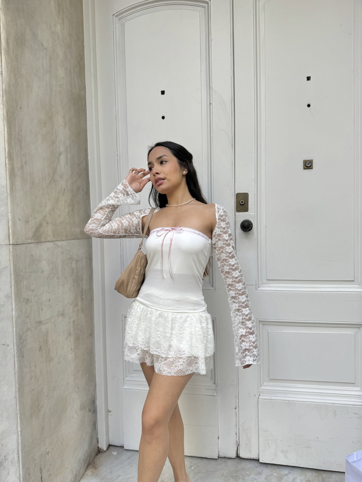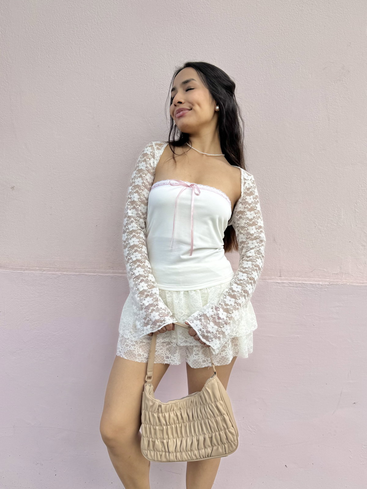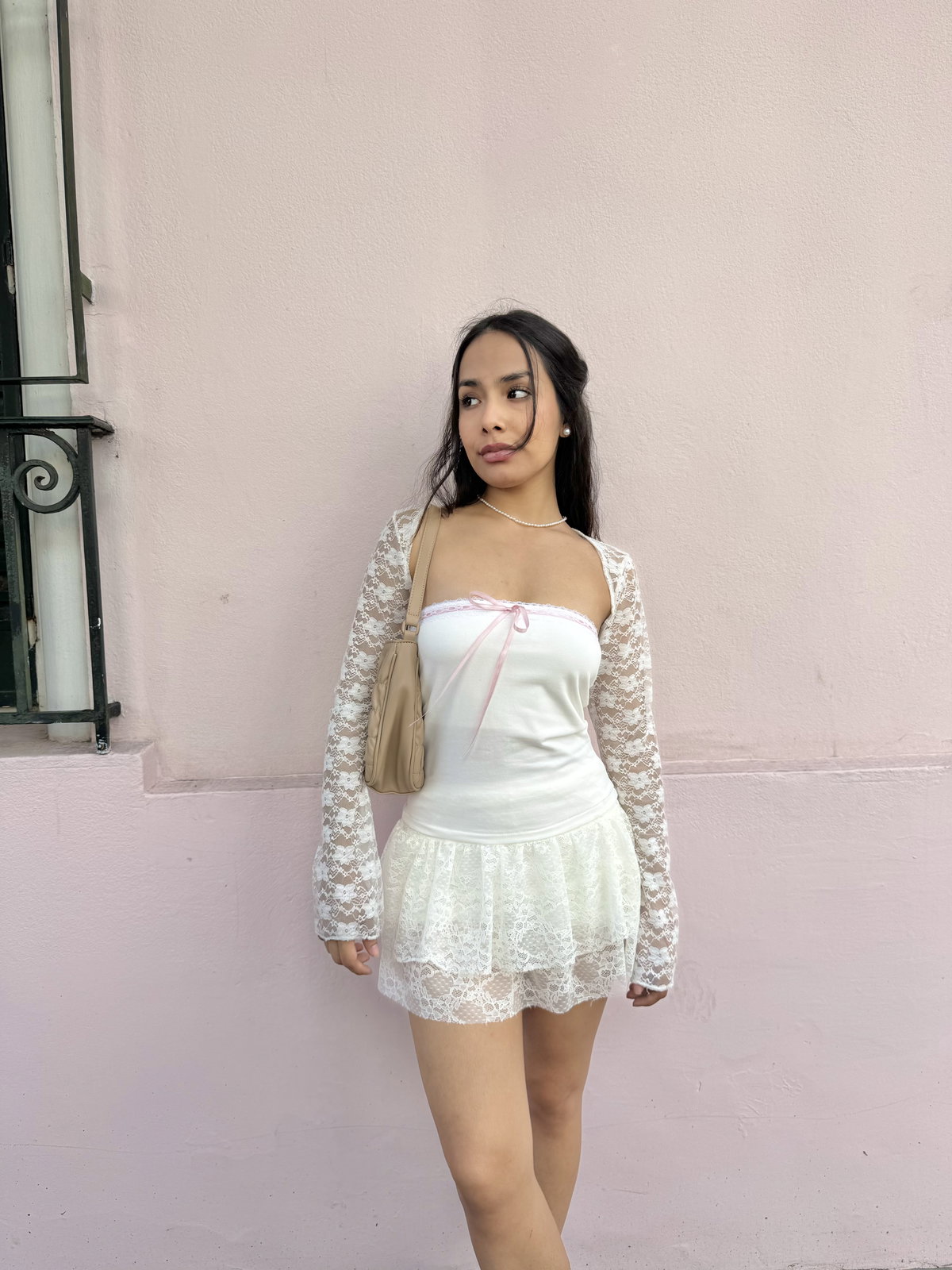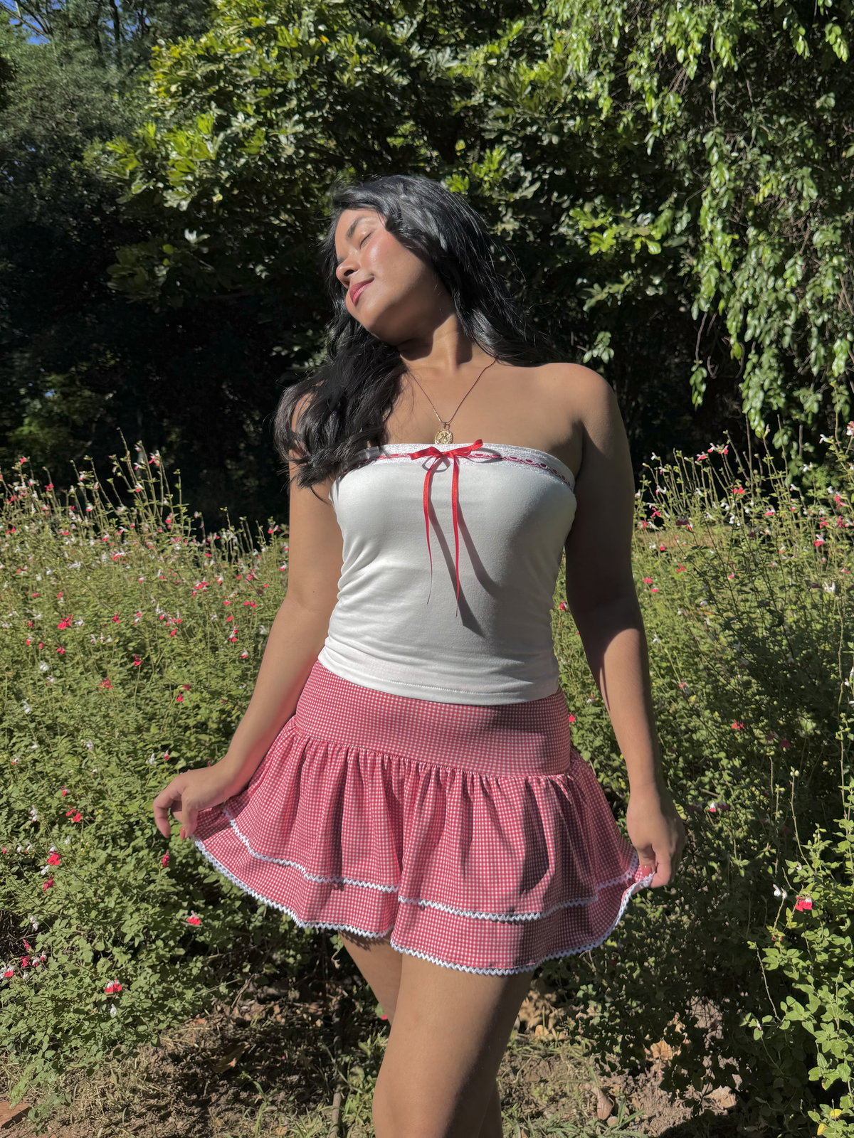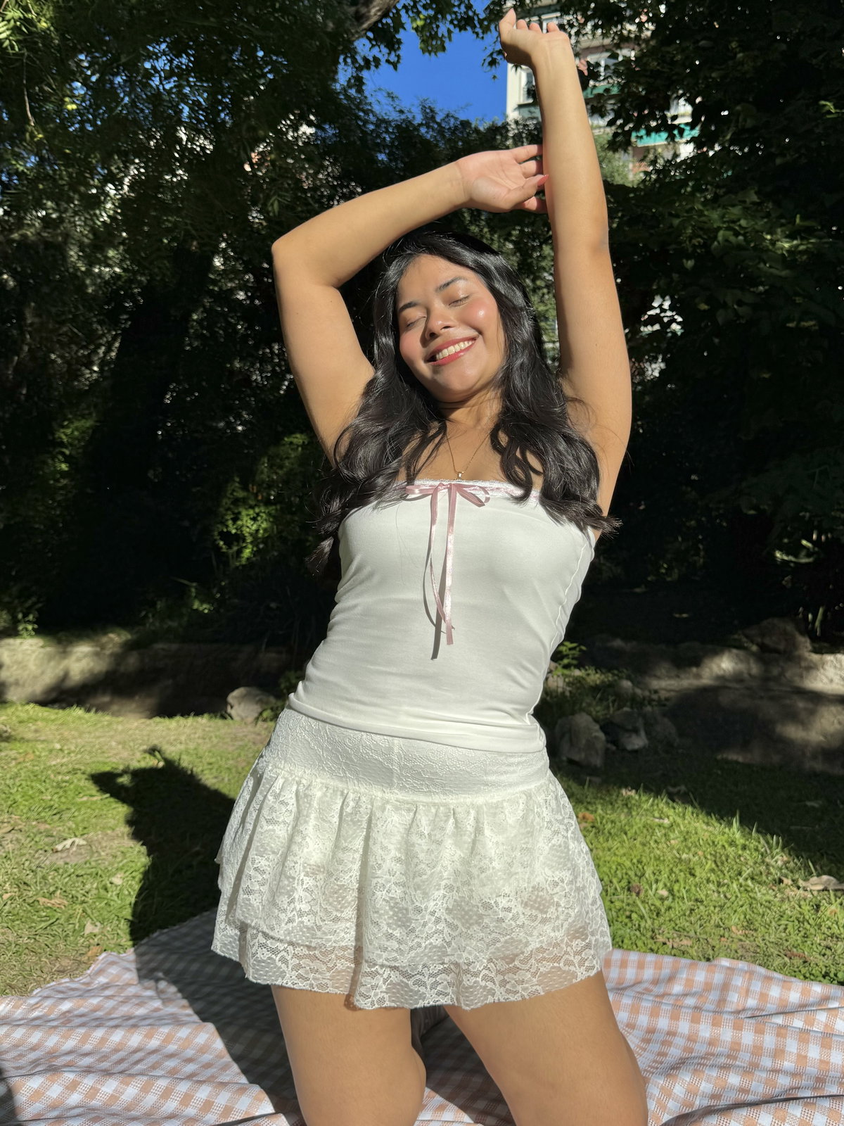 Top confeccionado en algodón con lycra premium, elastizado y fresquito. Para mayor sostén en la parte delatera tiene doble tela, en el escote tiene puntilla pasacinta y detalle de cintas de raso largas para hacer un moñito.