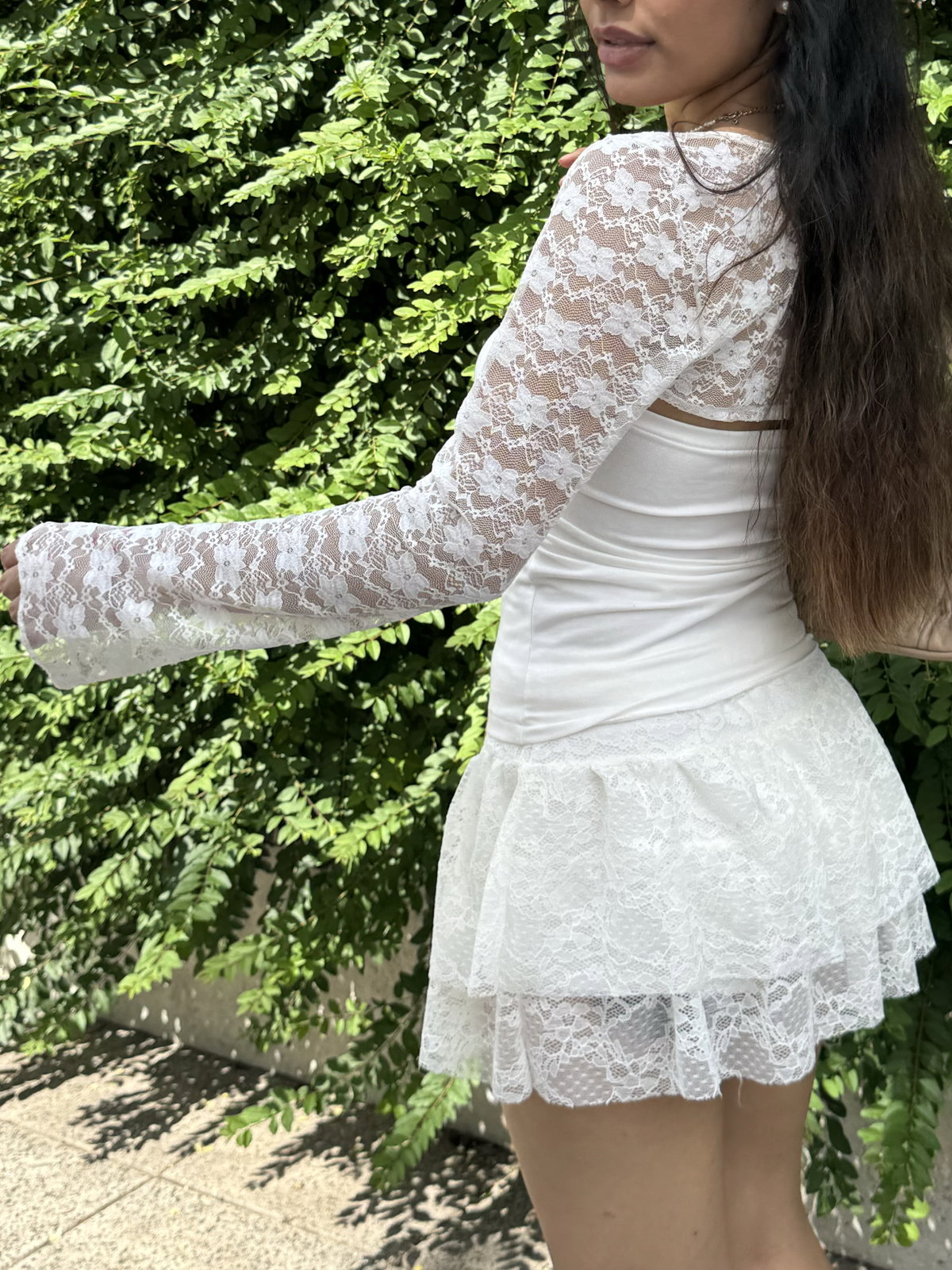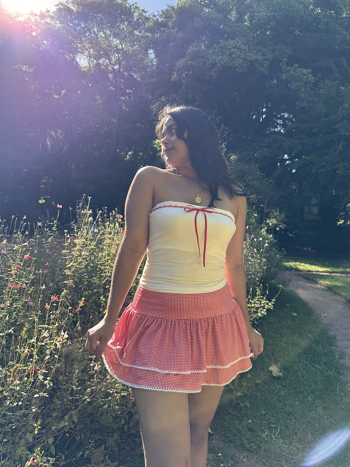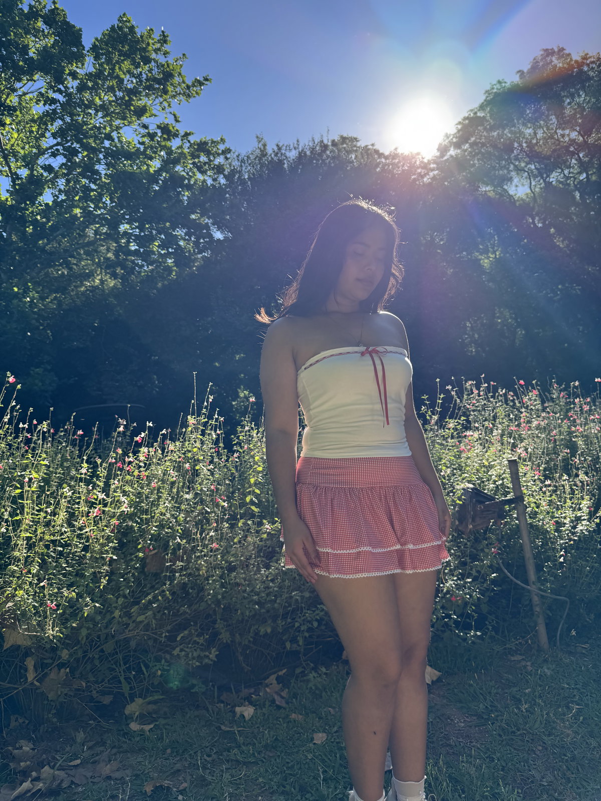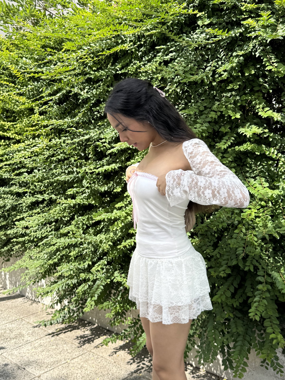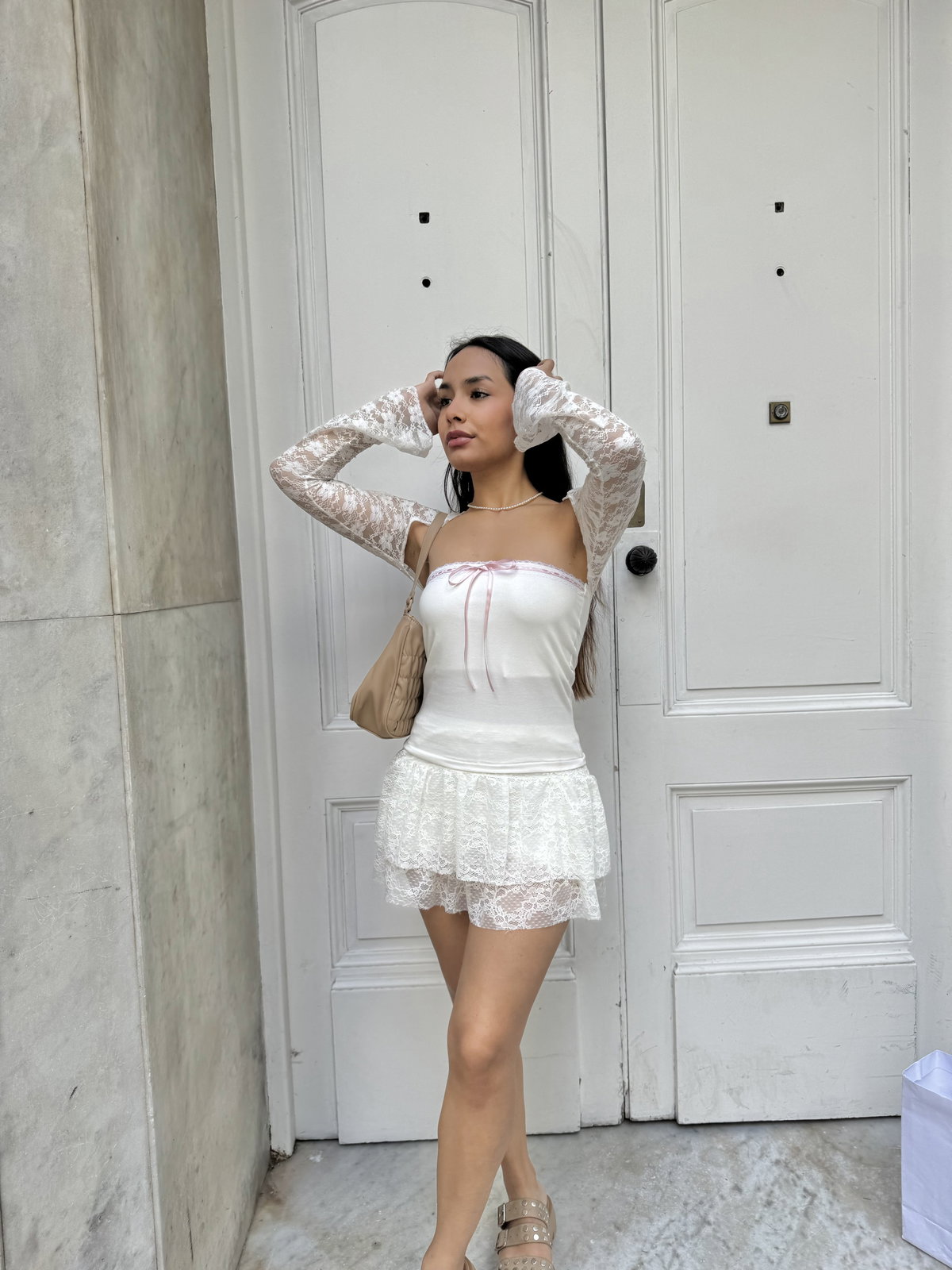 Top confeccionado en algodón con lycra premium, elastizado y fresquito. Para mayor sostén en la parte delatera tiene doble tela, en el escote tiene puntilla pasacinta y detalle de cintas de raso largas para hacer un moñito.