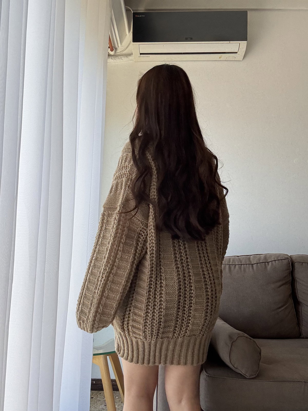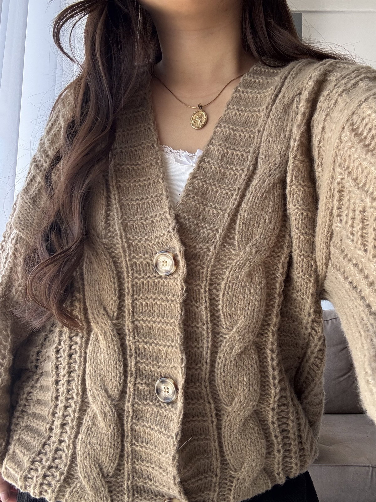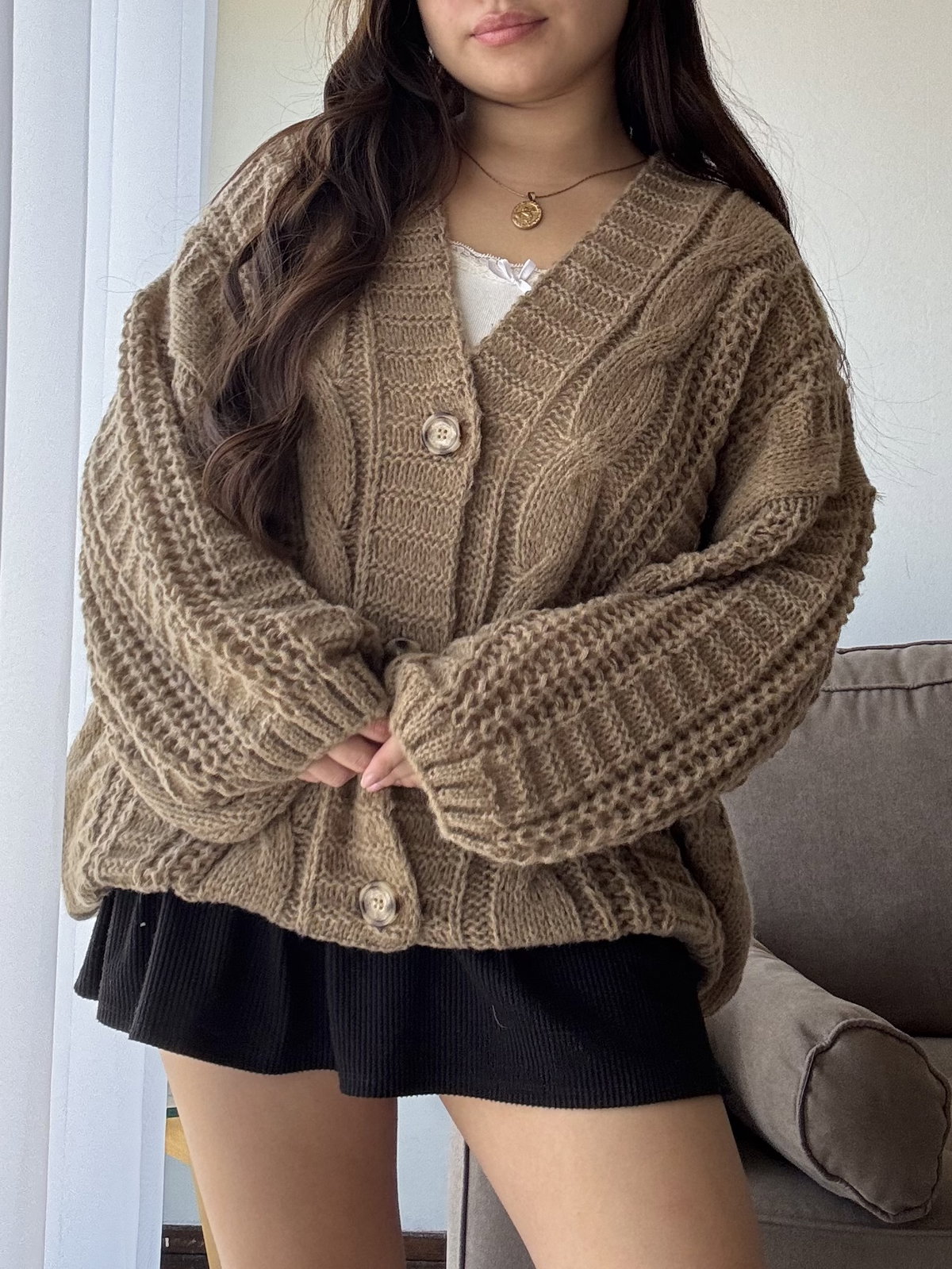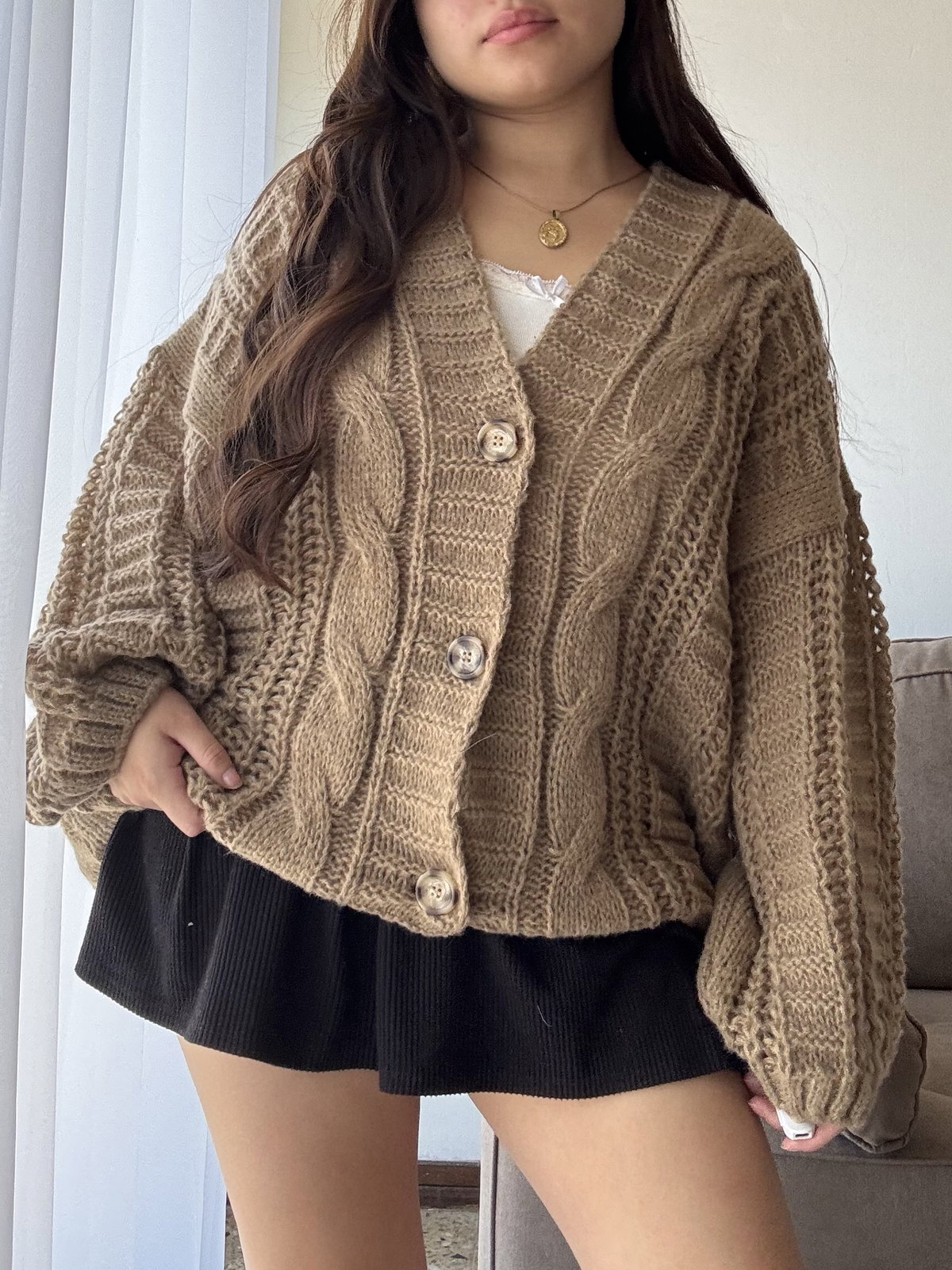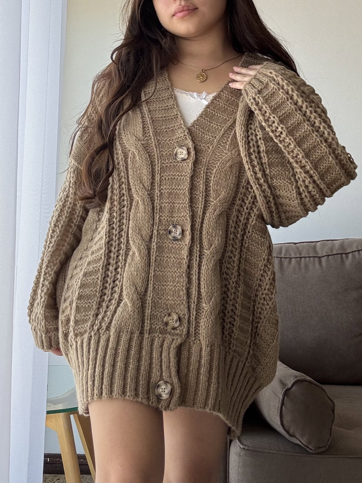 Cardigan largo de lana Friss. Corte superior oversize con mangas globo y botones de plástico mármoleado (bicolor).