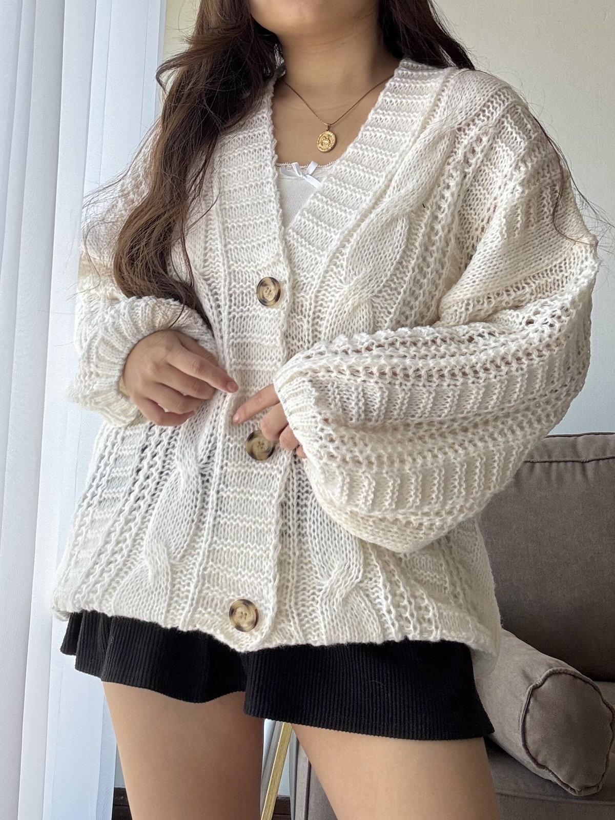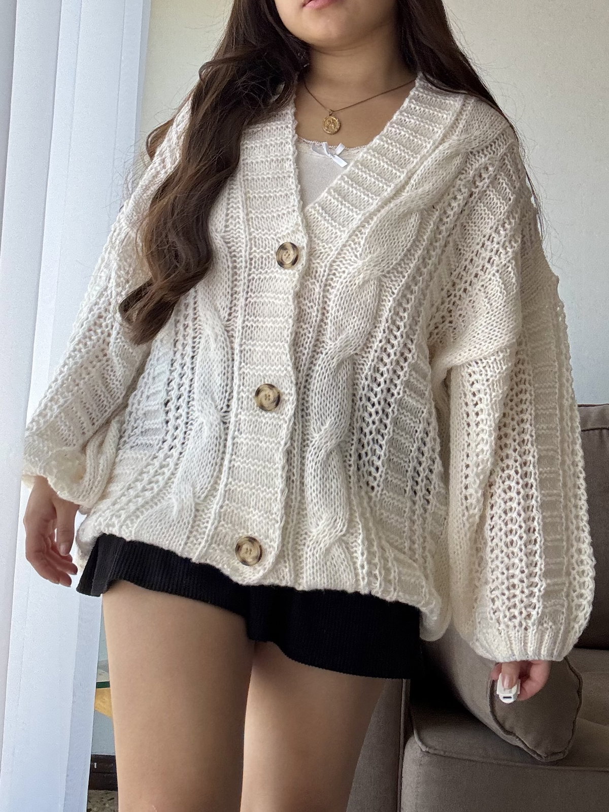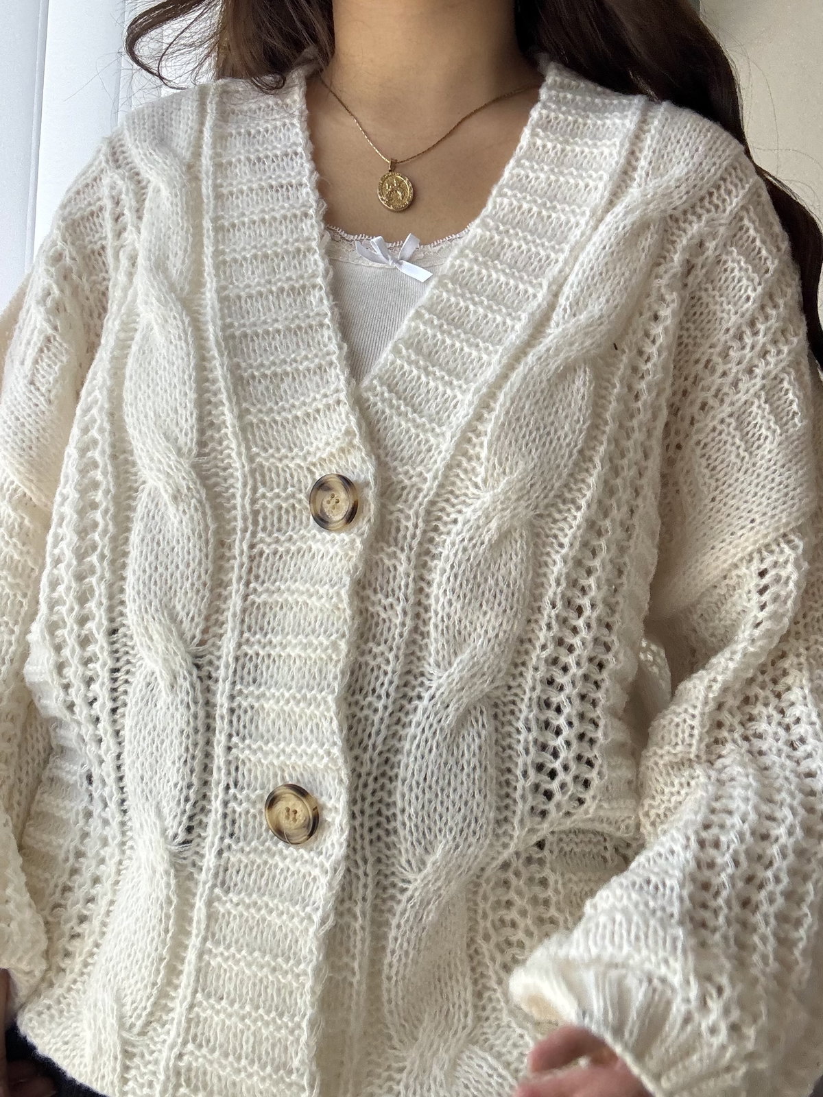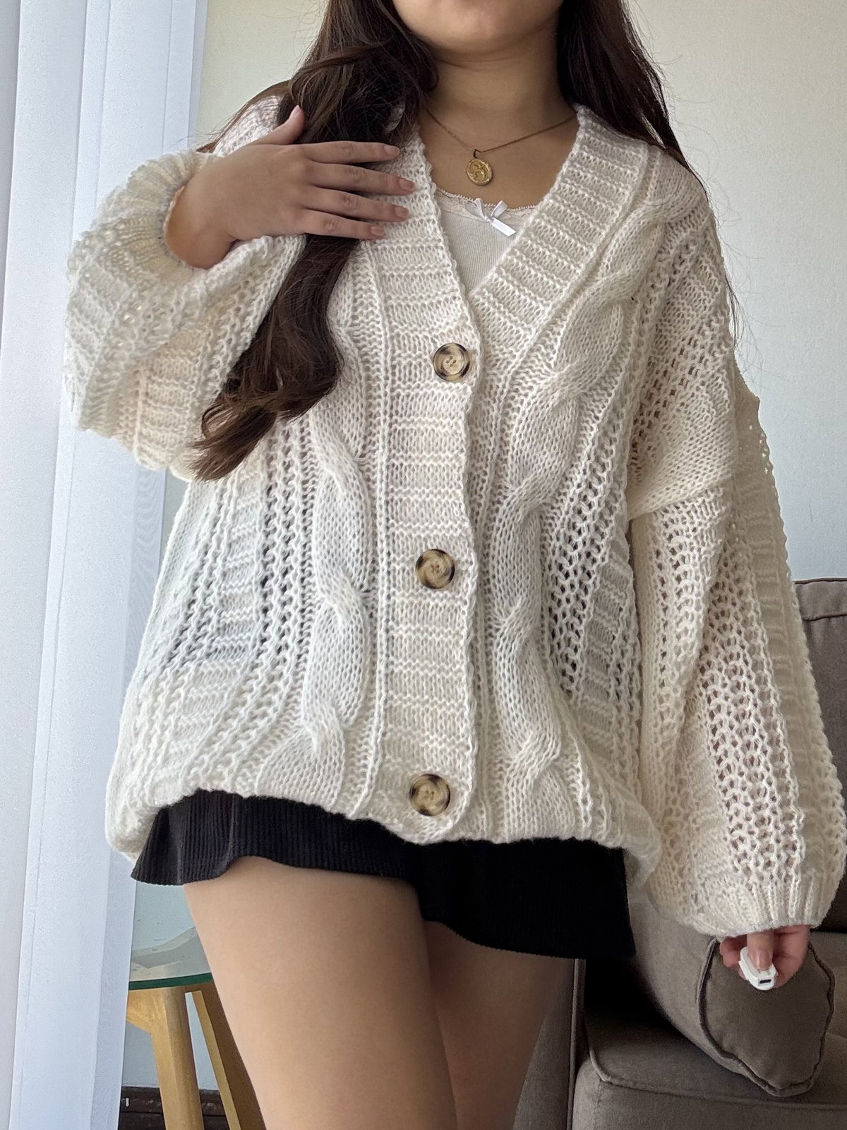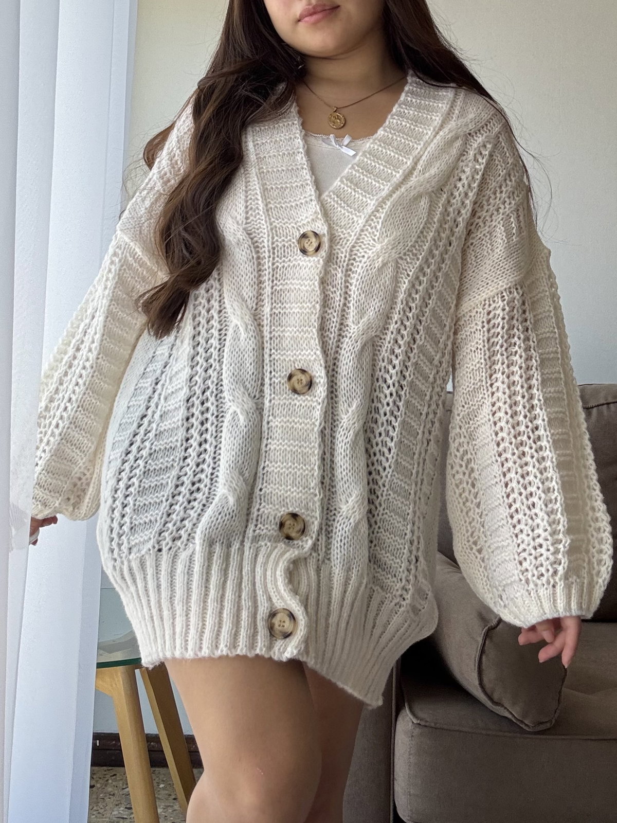 Cardigan largo de lana Friss. Corte superior oversize con mangas globo y botones de plástico mármoleado (bicolor).