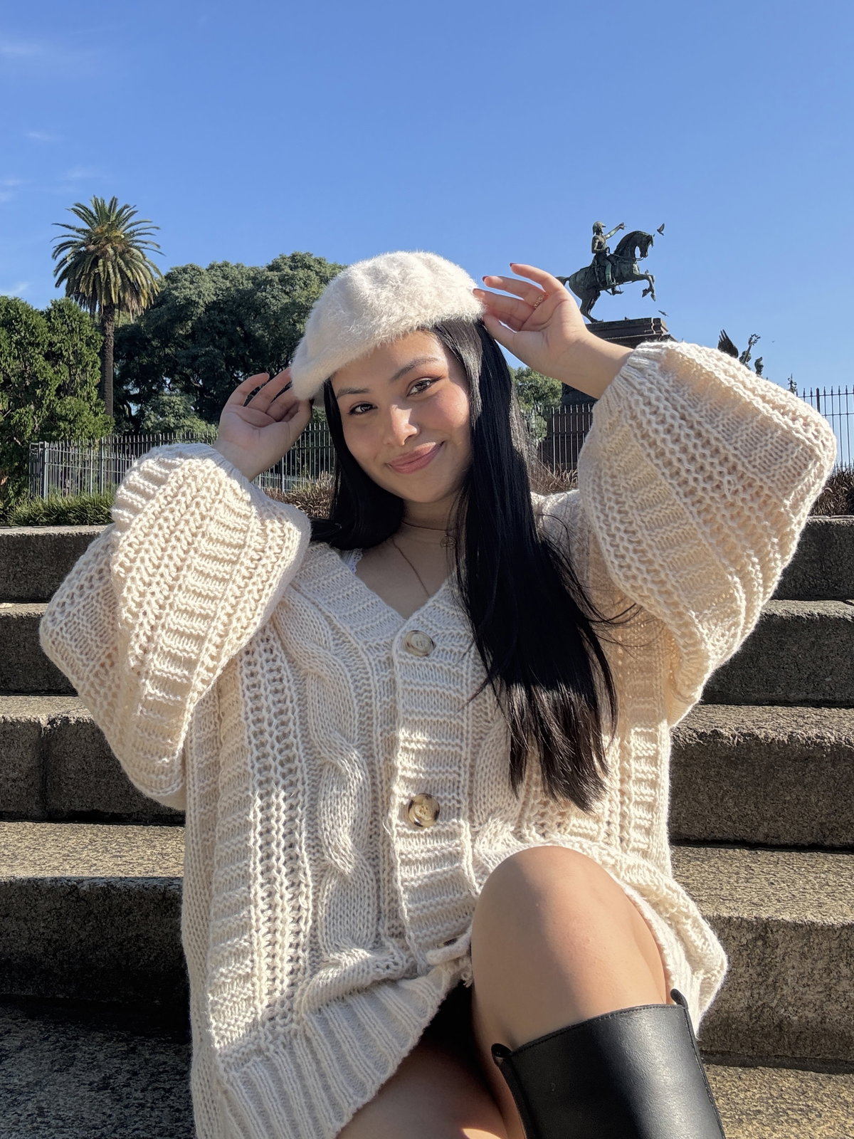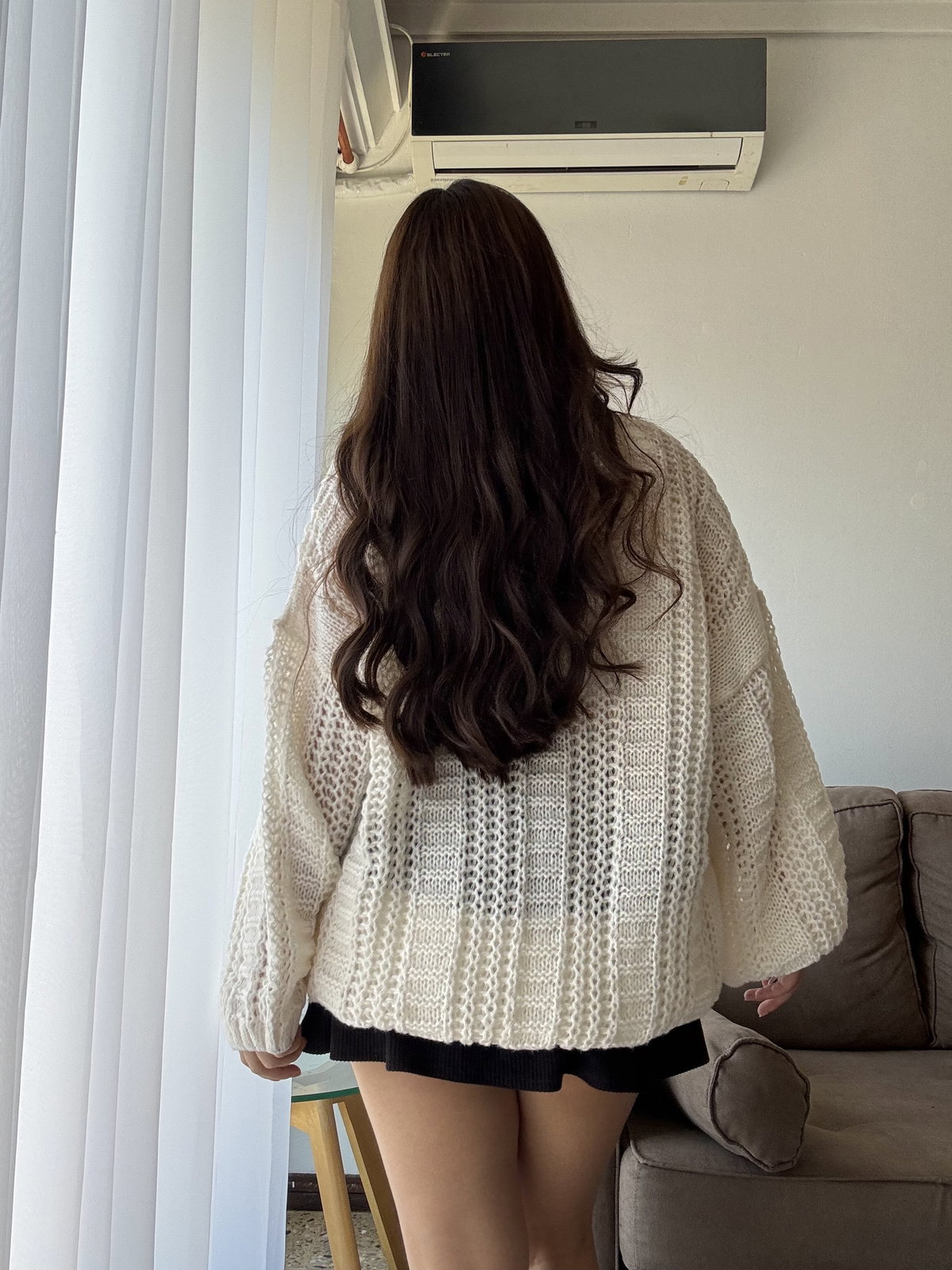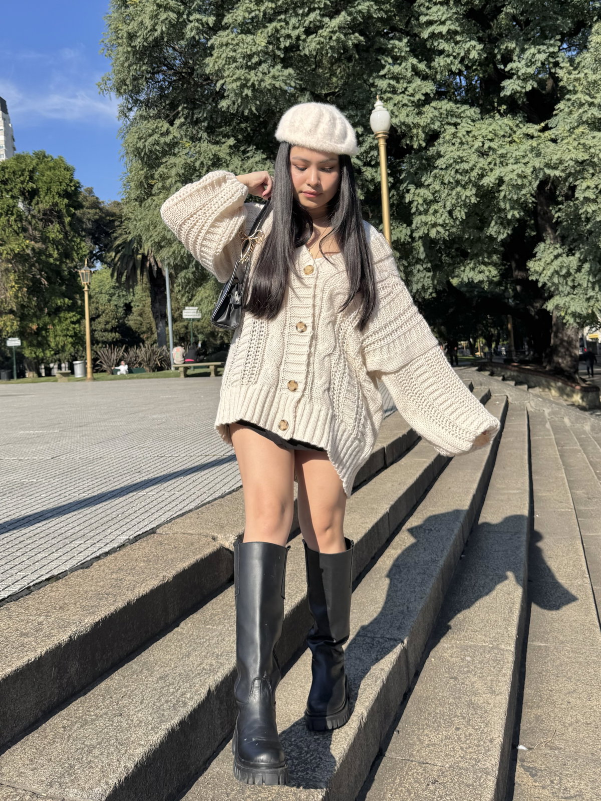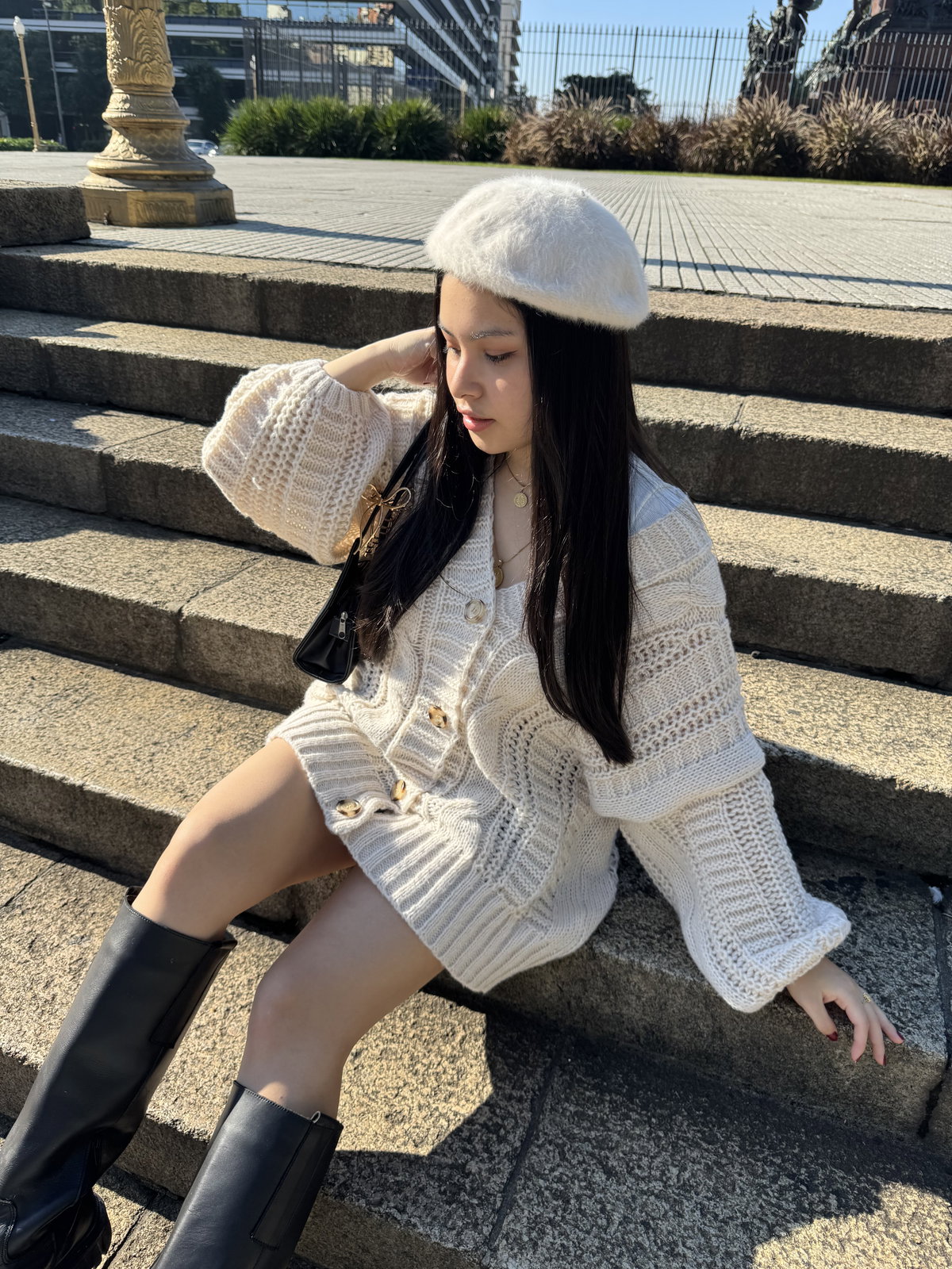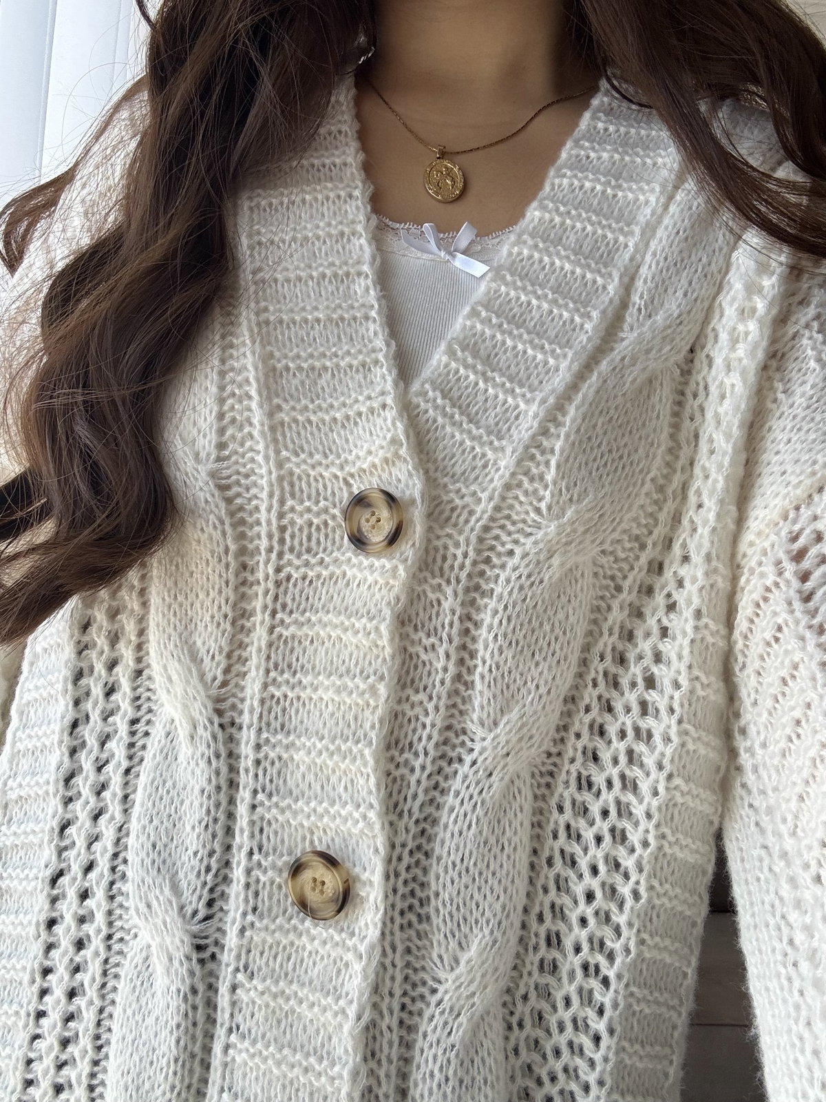 Cardigan largo de lana Friss. Corte superior oversize con mangas globo y botones de plástico mármoleado (bicolor).