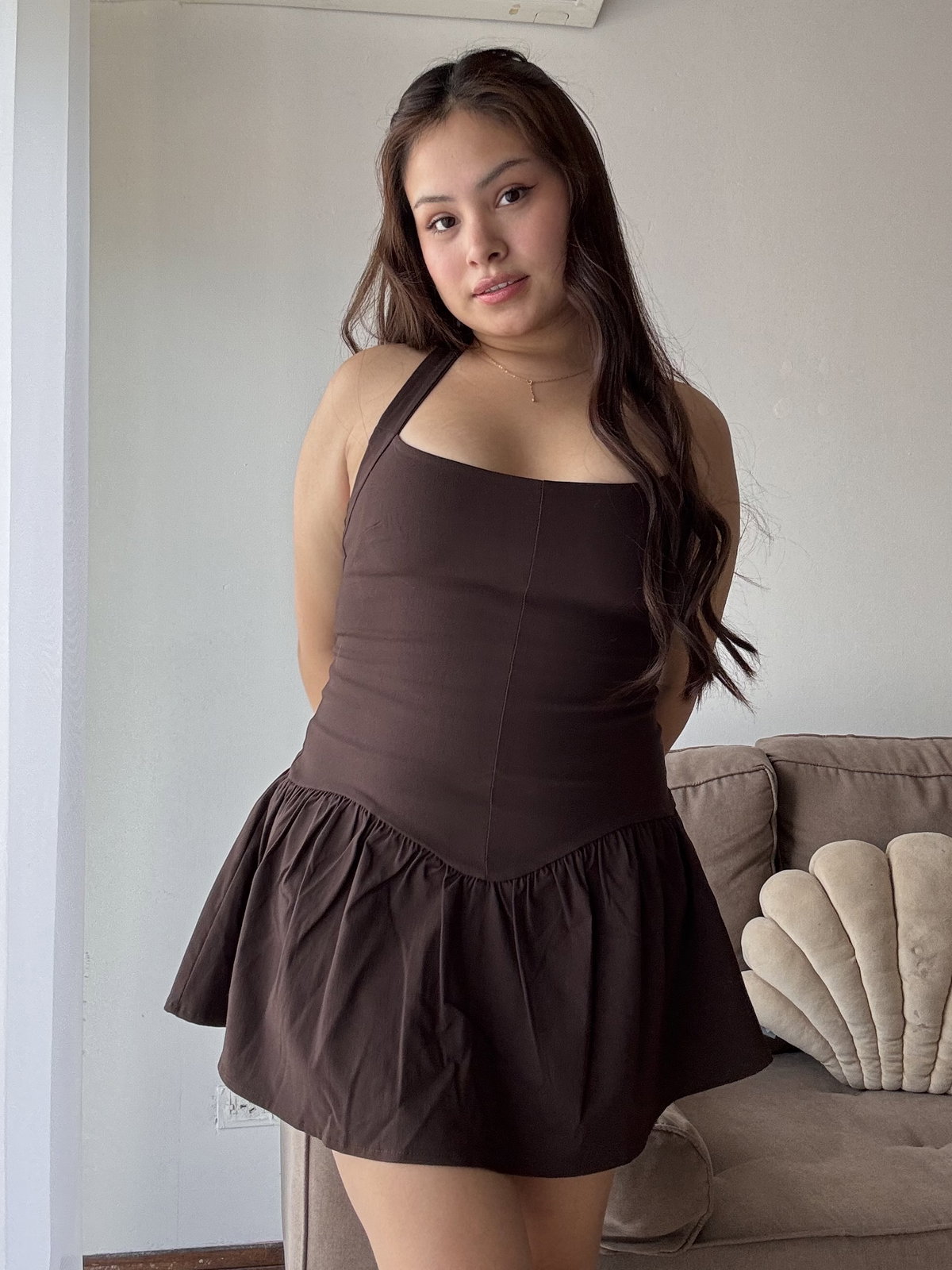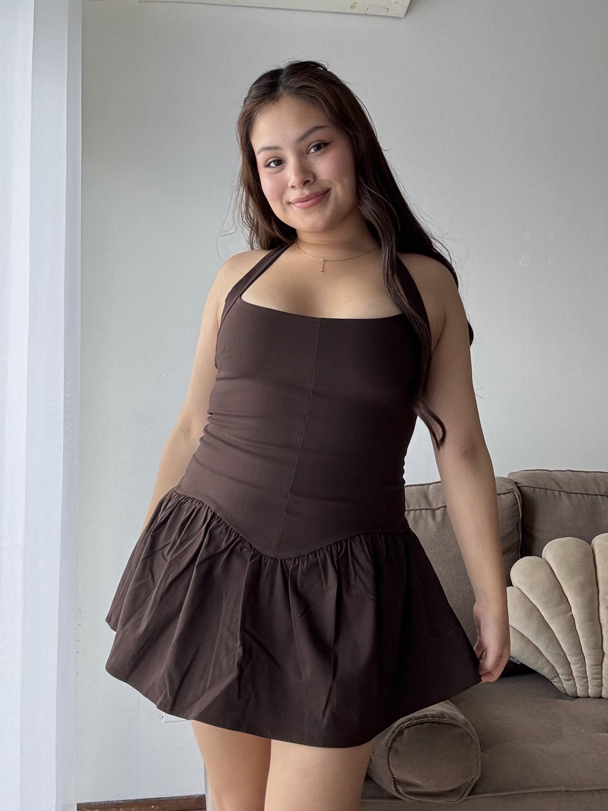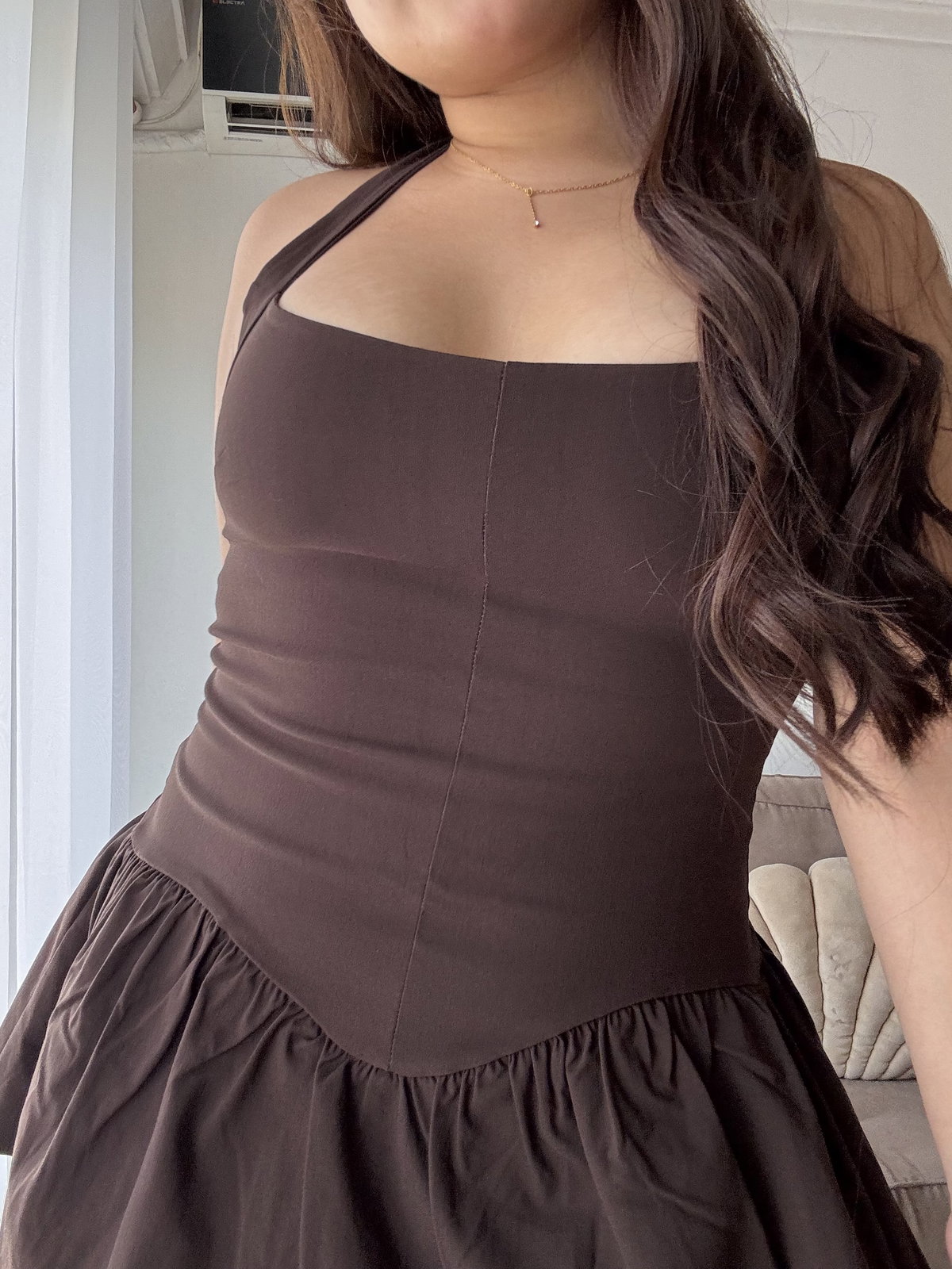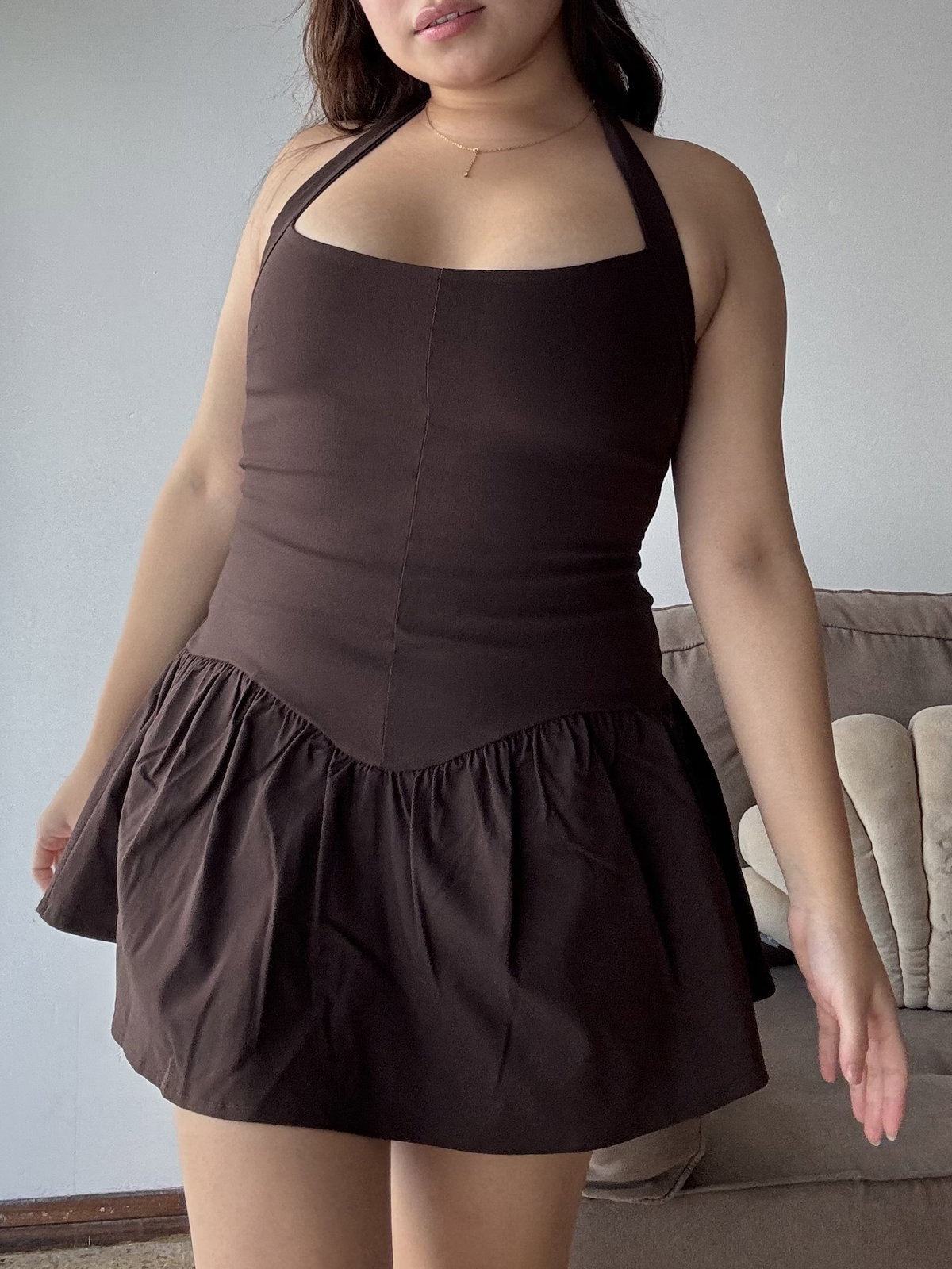 Vestido confeccionado en bengalina, una tela súper elastizada que se adapta al cuerpo. Cuenta con doble tela en el pecho para mayor soporte y un calce entallado que estiliza la silueta tipo corset. La falda es amplia y posee short interno para mayor comodidad. Incluye tiras superiores para atar al cuello, brindando mayor seguridad, y cierre en la espalda.