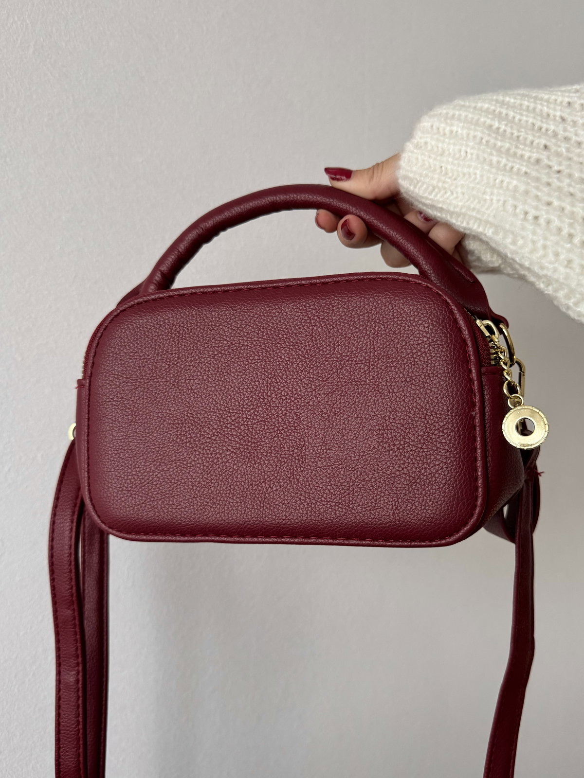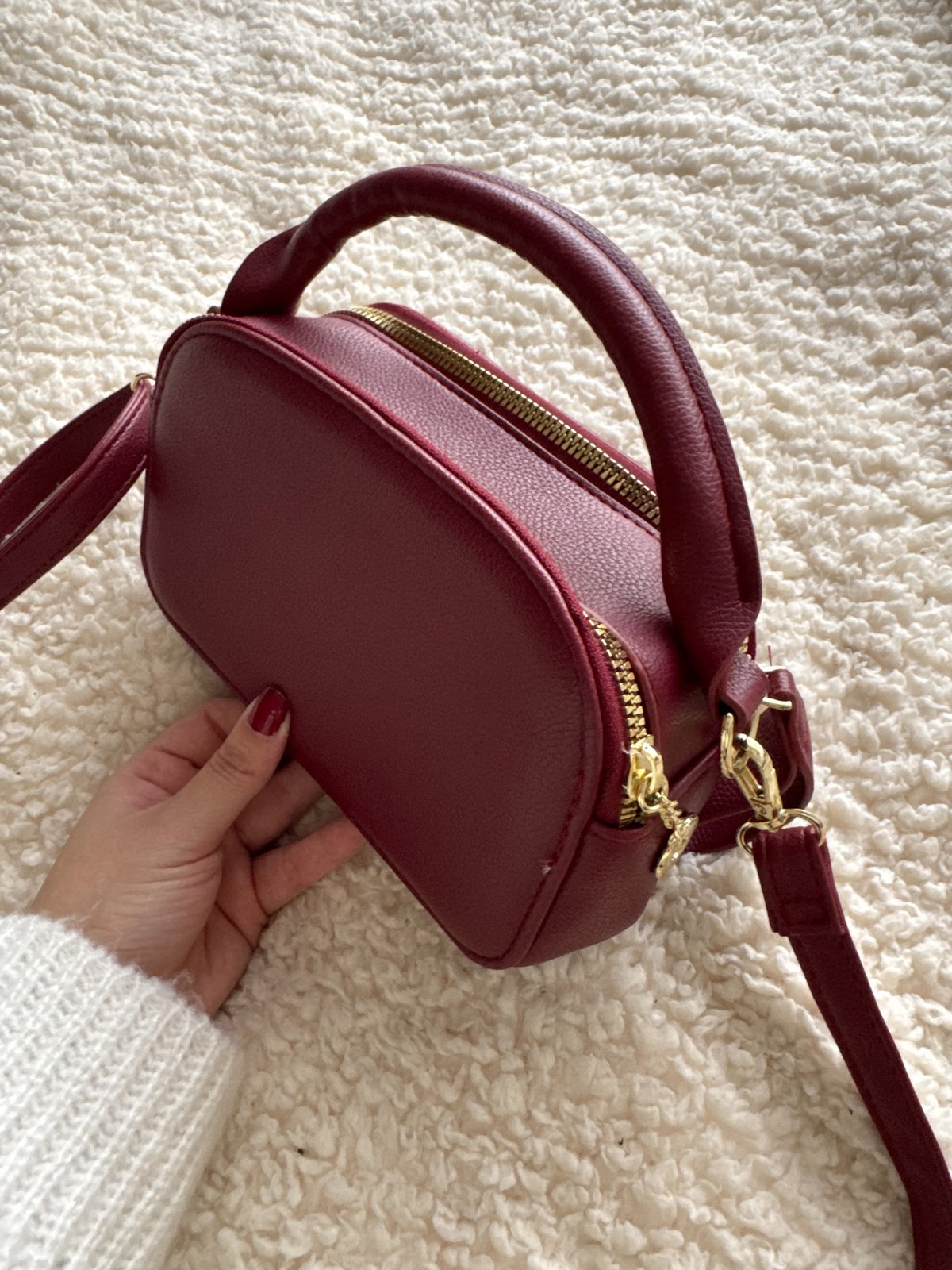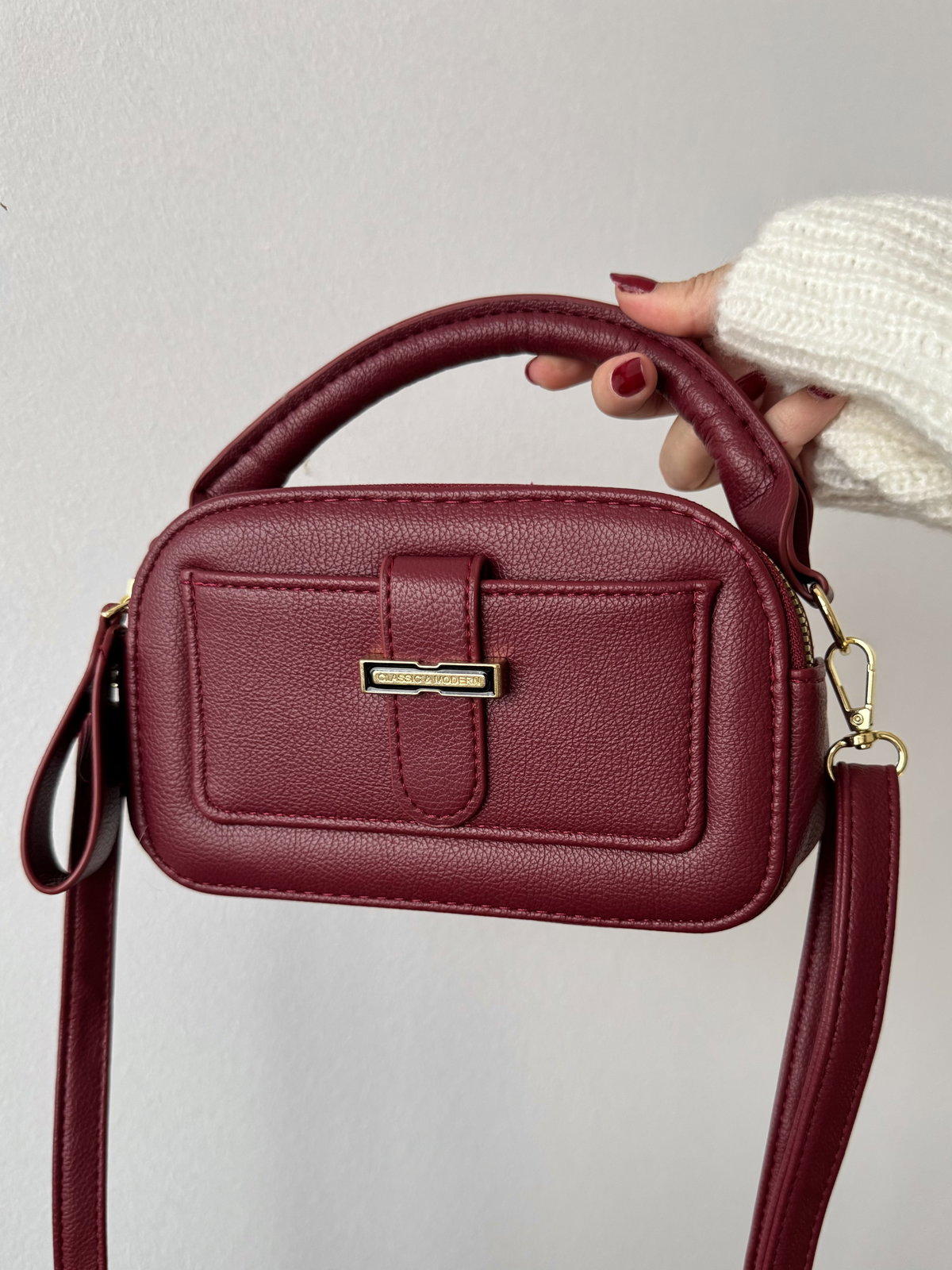 Morral de cuero sintético con cierre y herrajes metálicos. Cuenta con un bolsillo externo y su interior está forrado. Tiene doble cierre lo cual permite que se use de ambos lados, ejemplo en las fotos.
