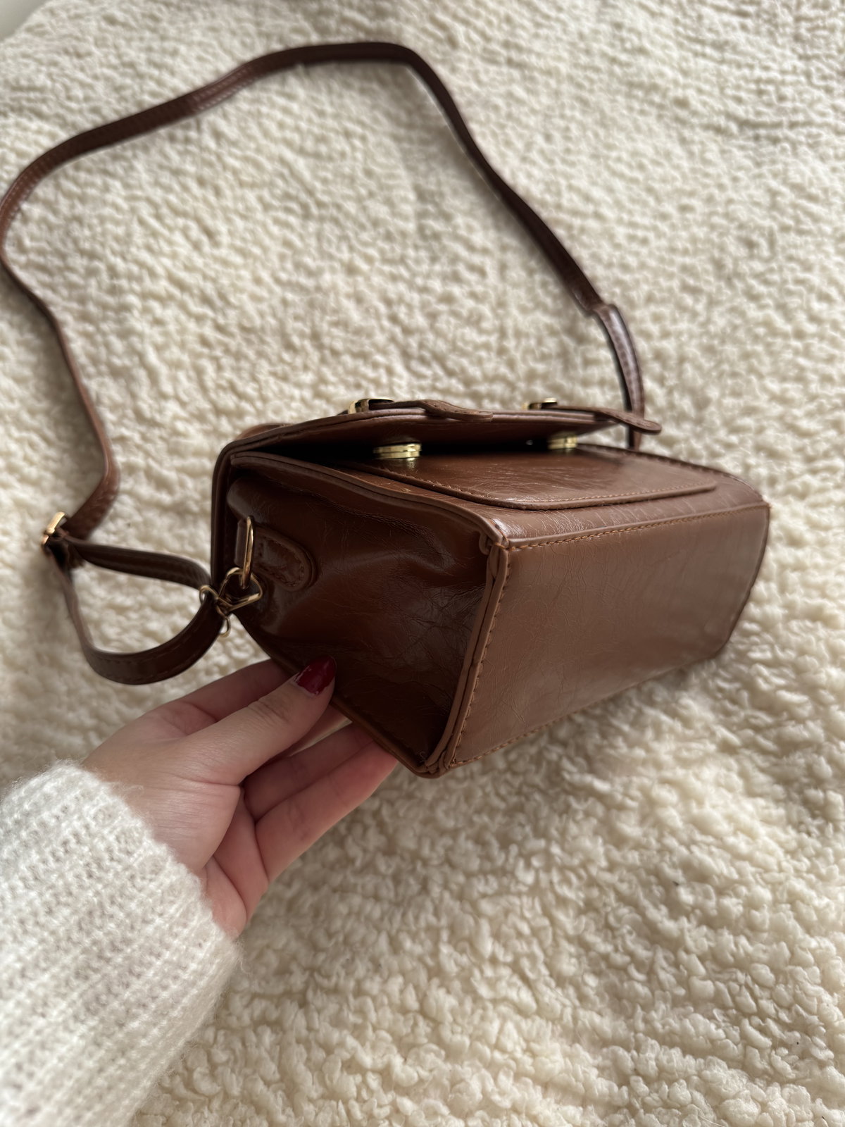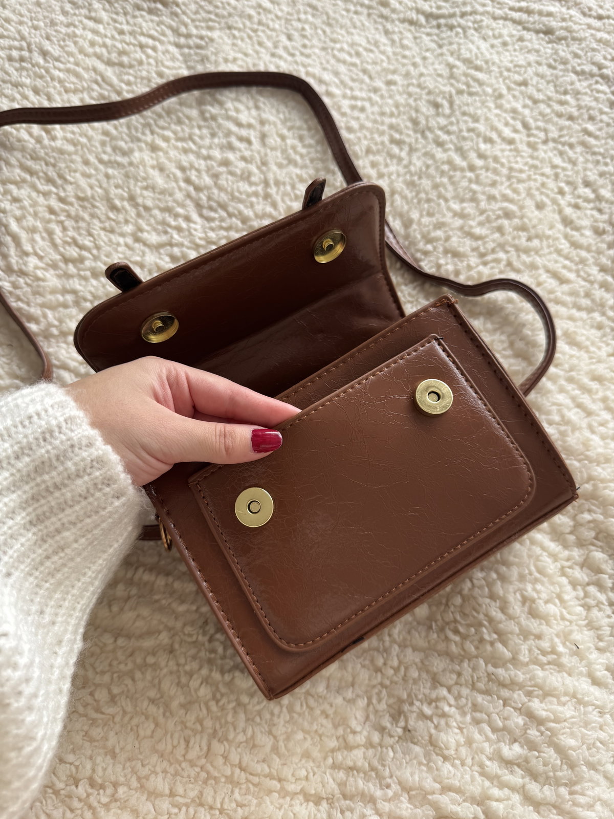 Cartera de cuero sintético con iman y herrajes metálicos. Su interior no está forrado. Incluye tira al hombro regulable, ideal para uso diario.