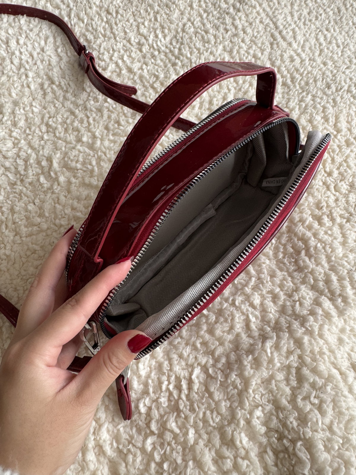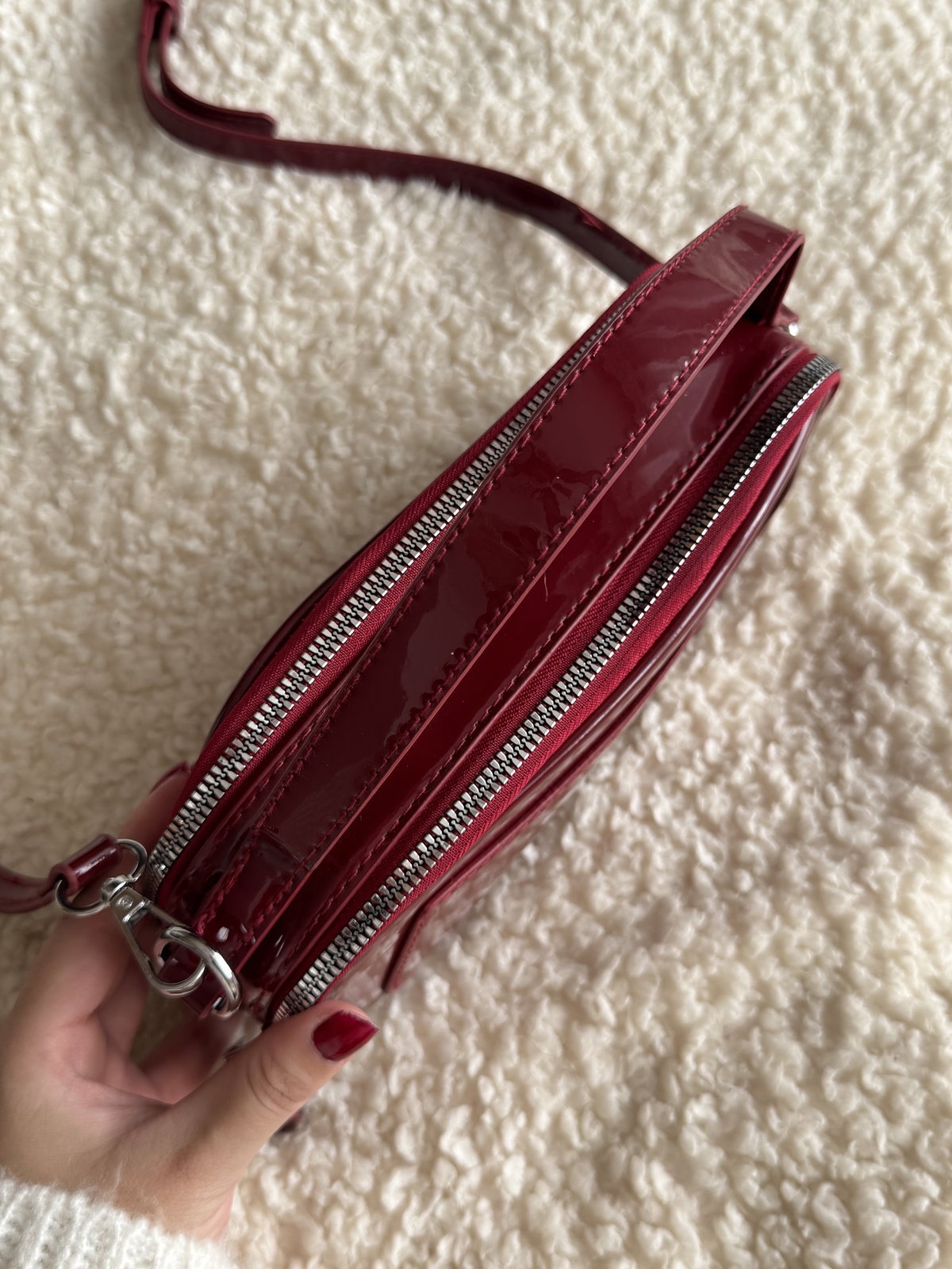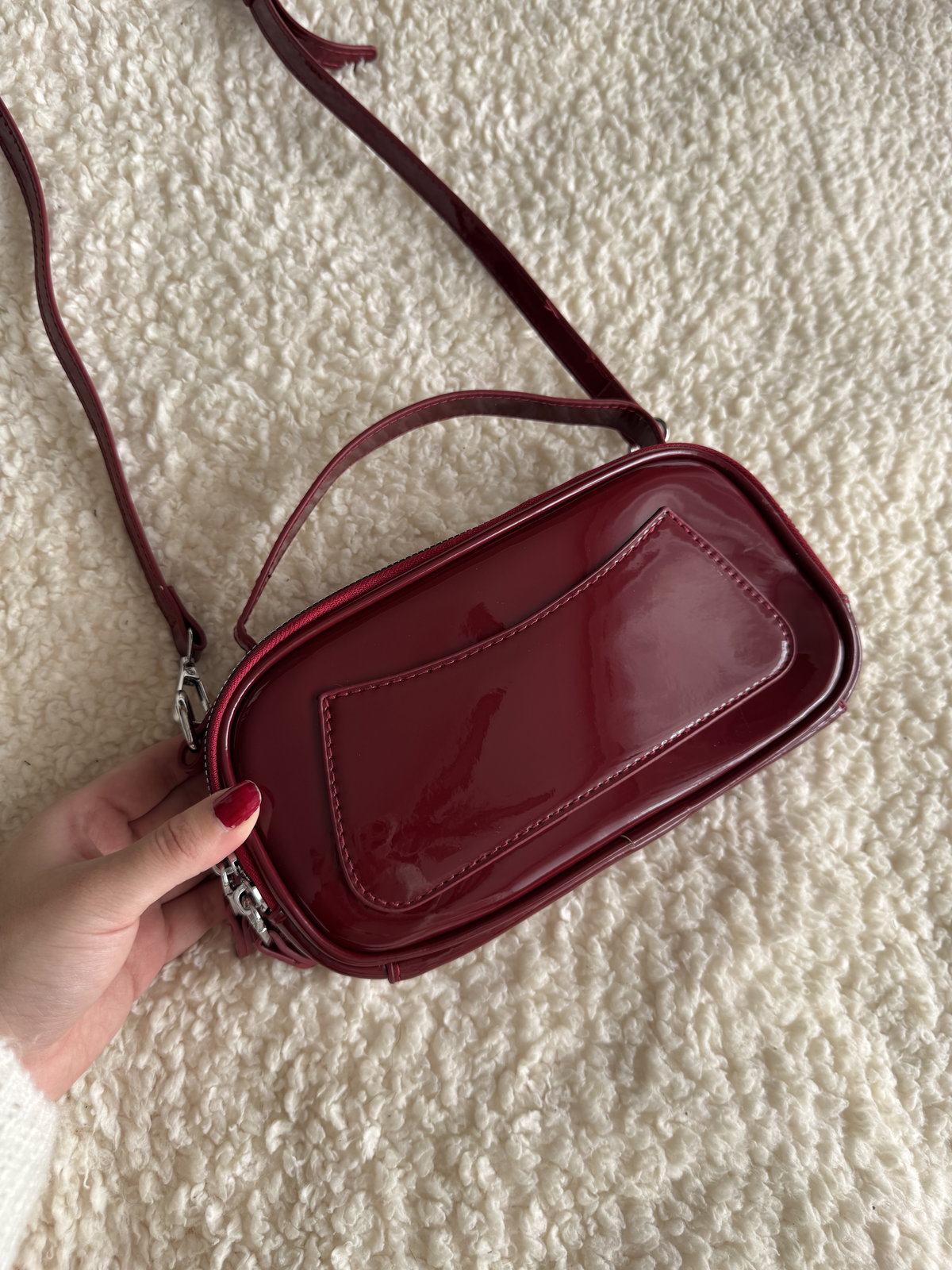 Morral de charol con cierre y herrajes metálicos. Cuenta con un bolsillo externo y su interior está forrado. Tiene doble cierre lo cual permite que se use de ambos lados, ejemplo en las fotos.