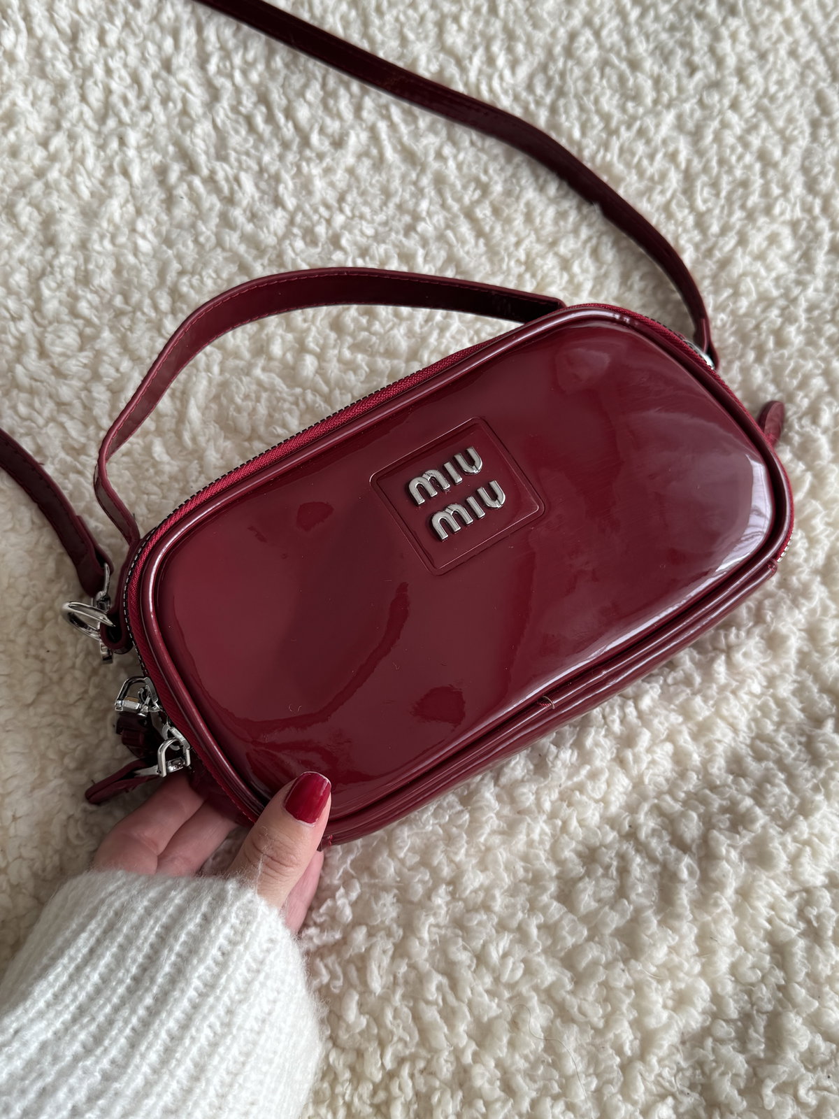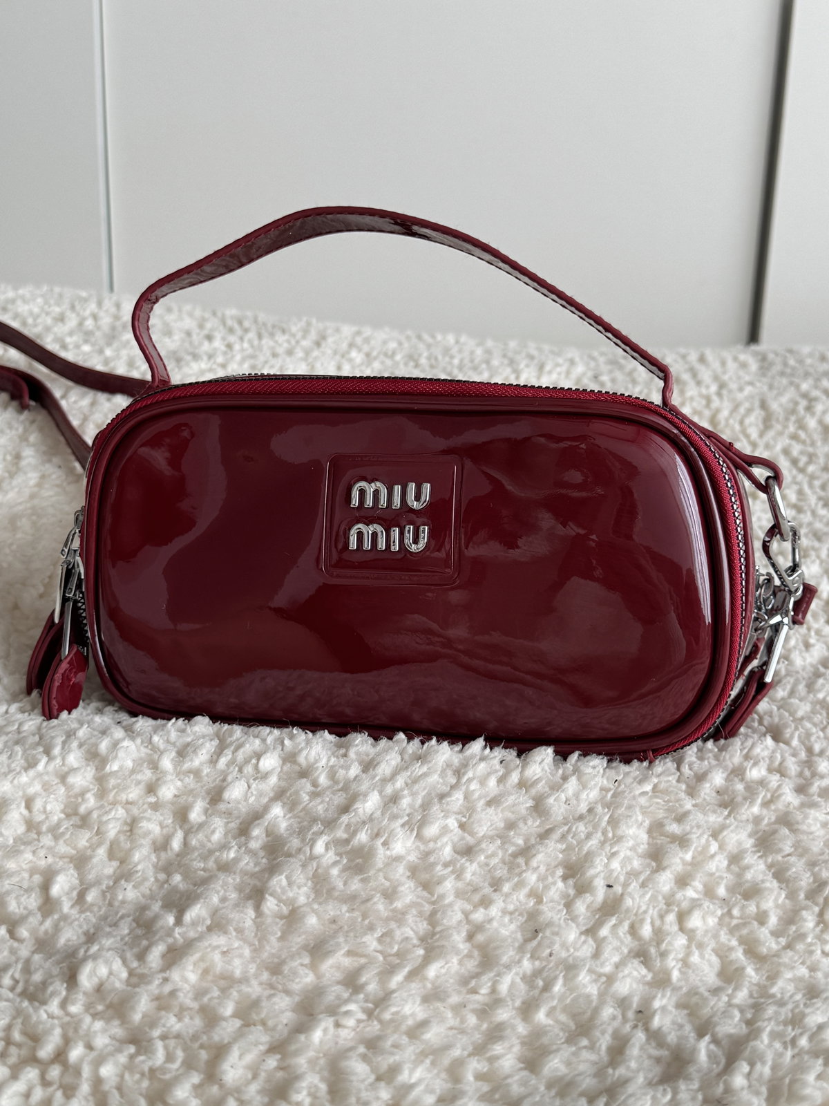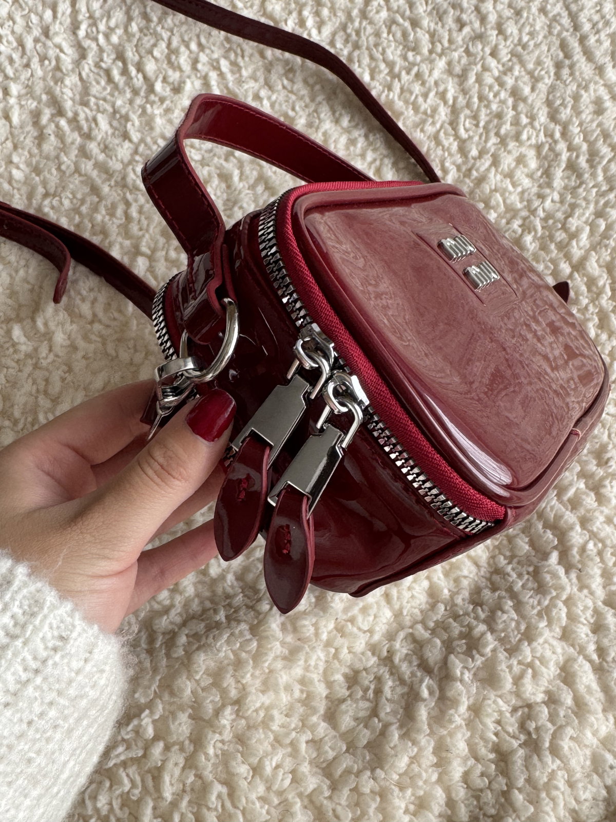 Morral de charol con cierre y herrajes metálicos. Cuenta con un bolsillo externo y su interior está forrado. Tiene doble cierre lo cual permite que se use de ambos lados, ejemplo en las fotos.
