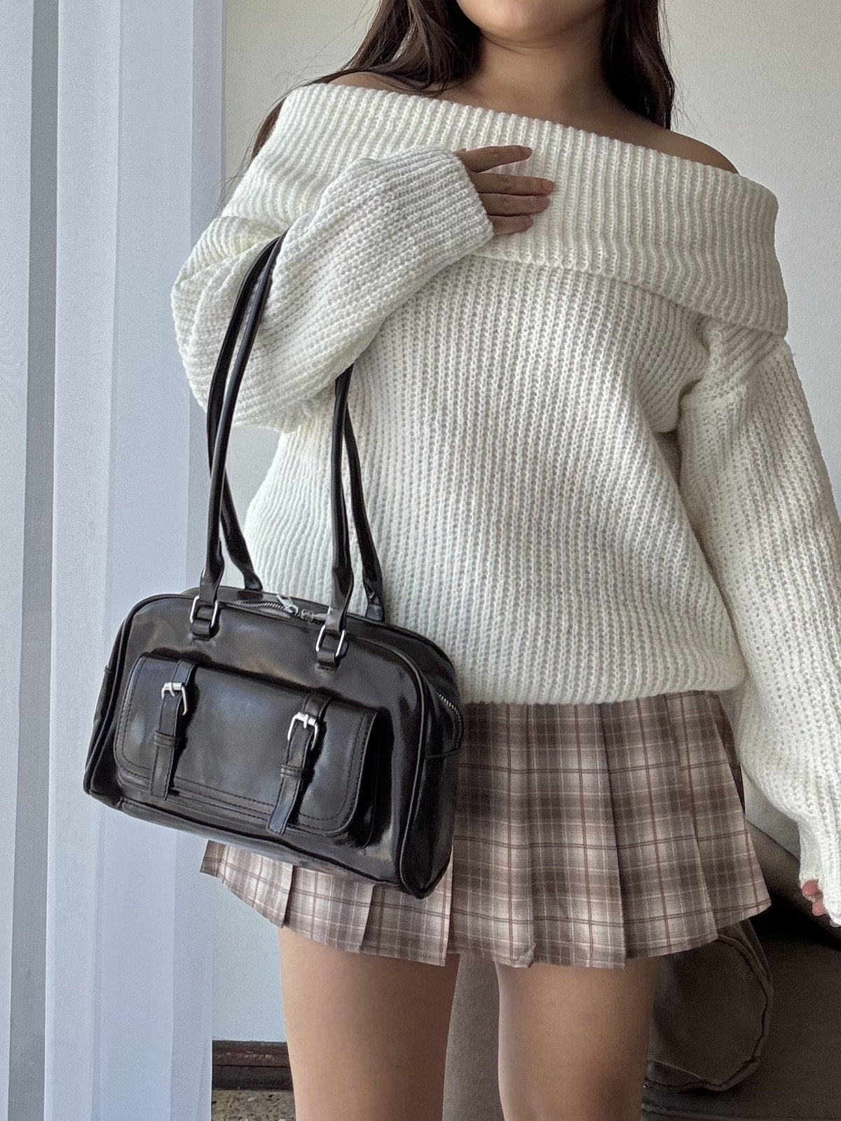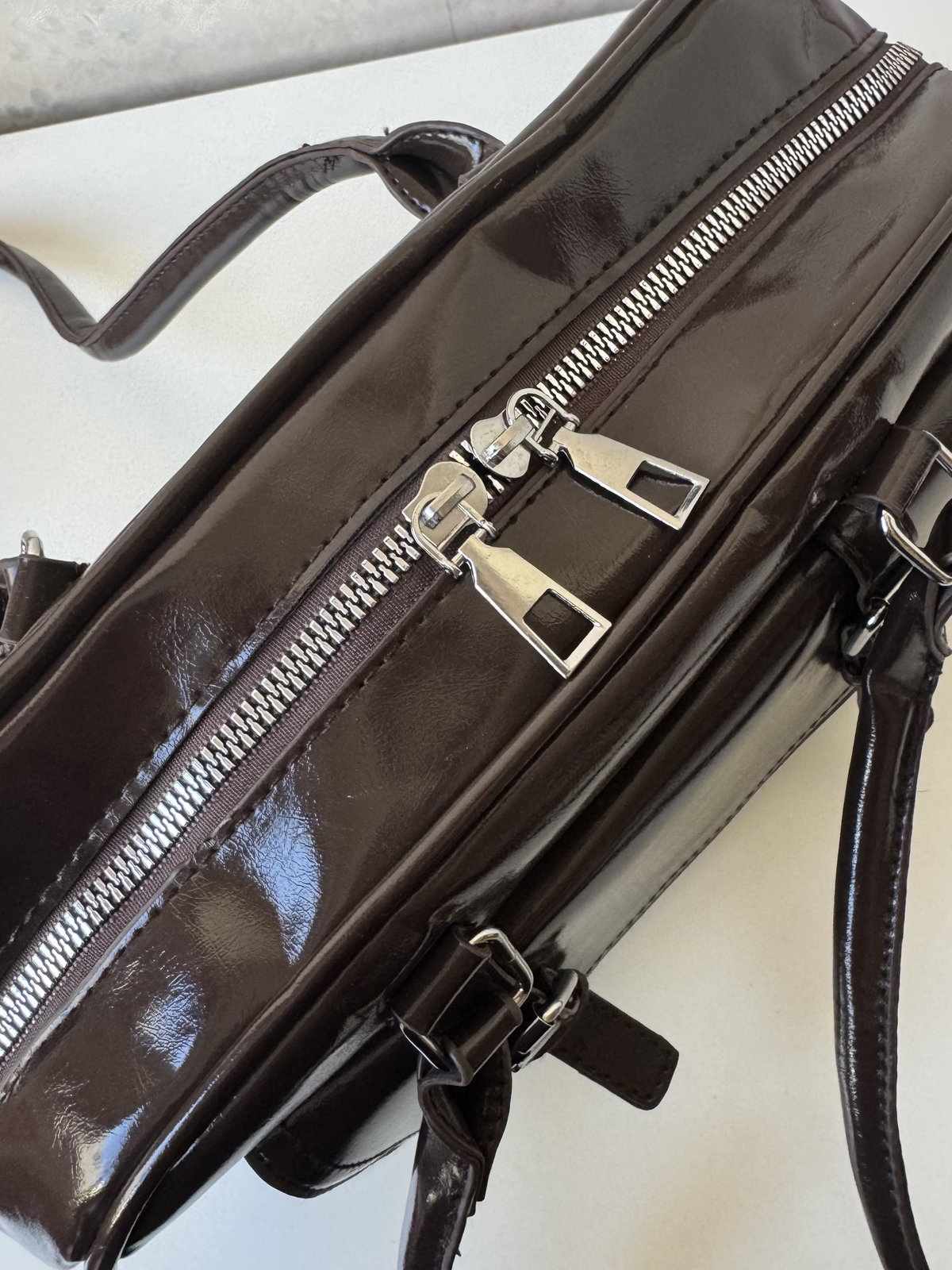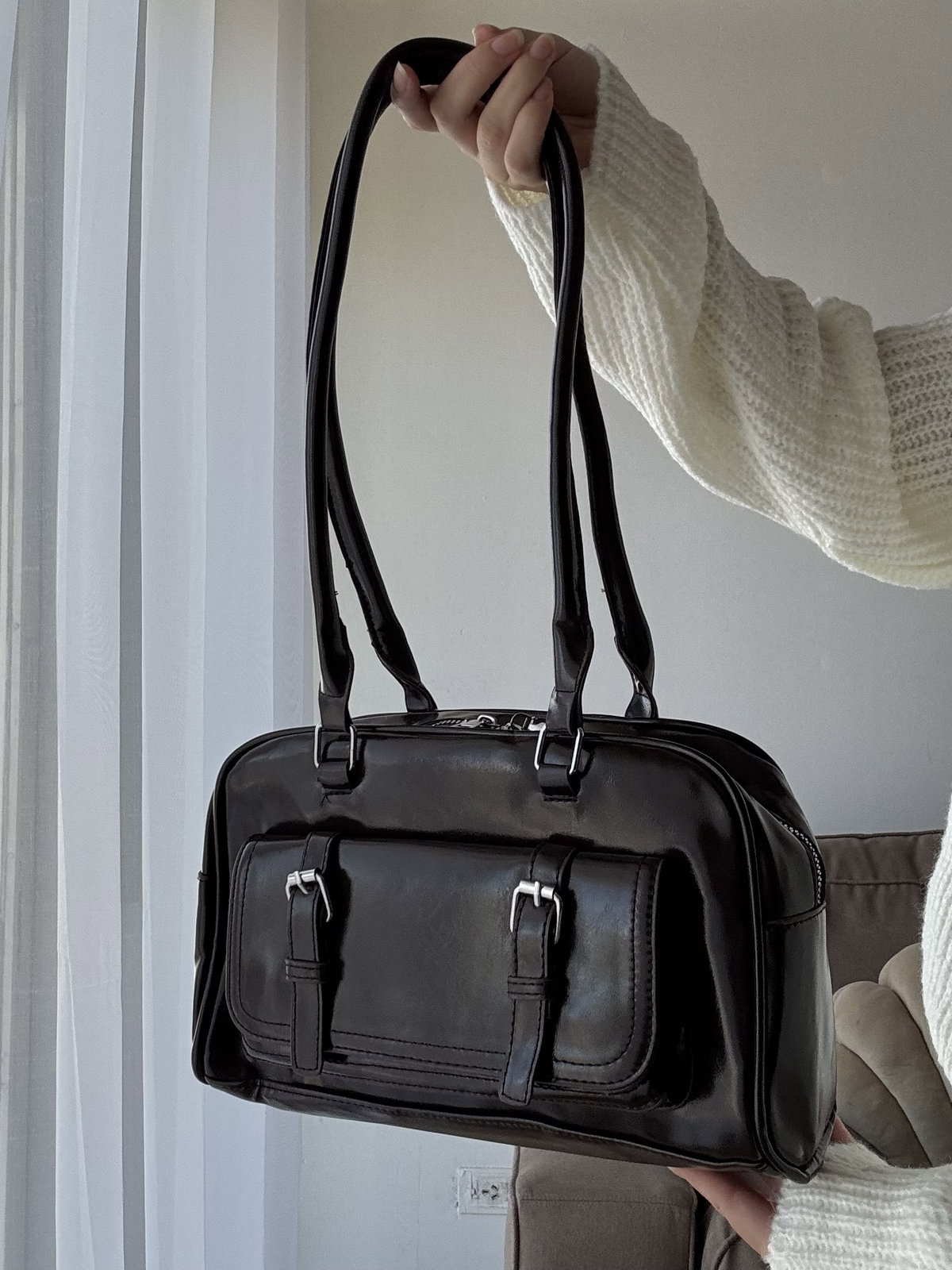 Cartera de cuero sintético con cierre y herrajes metálicos. Cuenta con un bolsillo externo y su interior no está forrado. Incluye tira al hombro no regulable, ideal para uso diario.