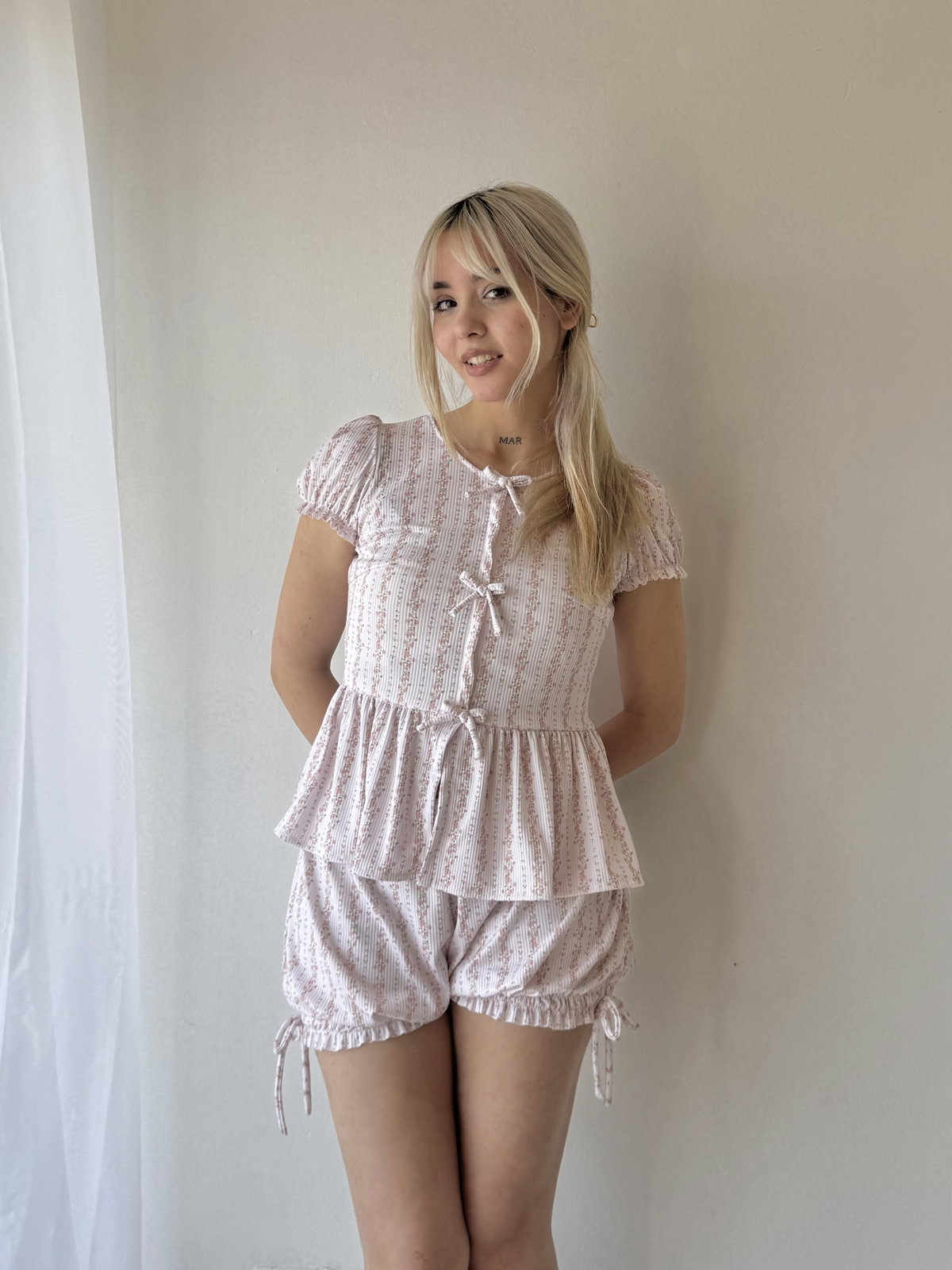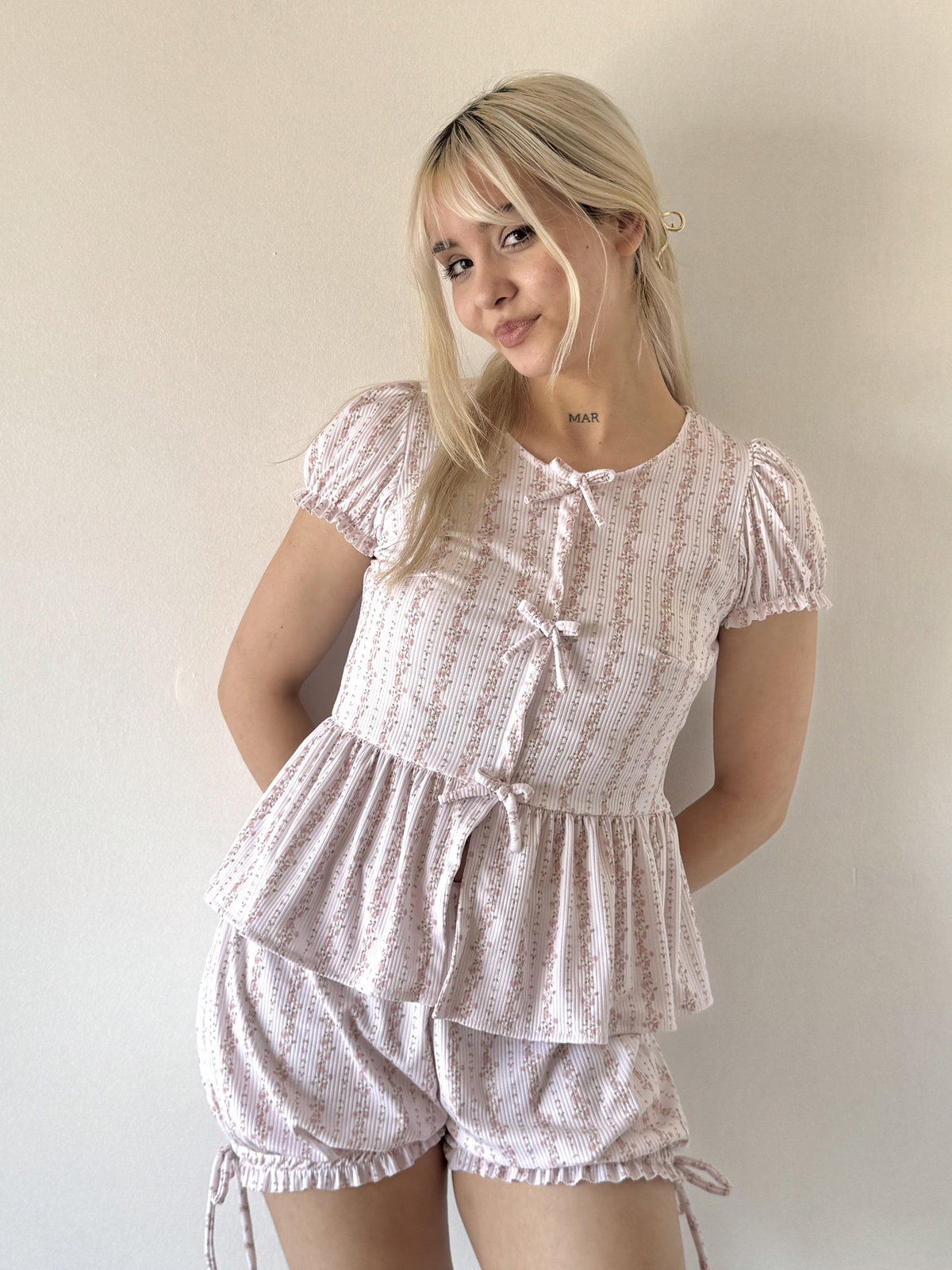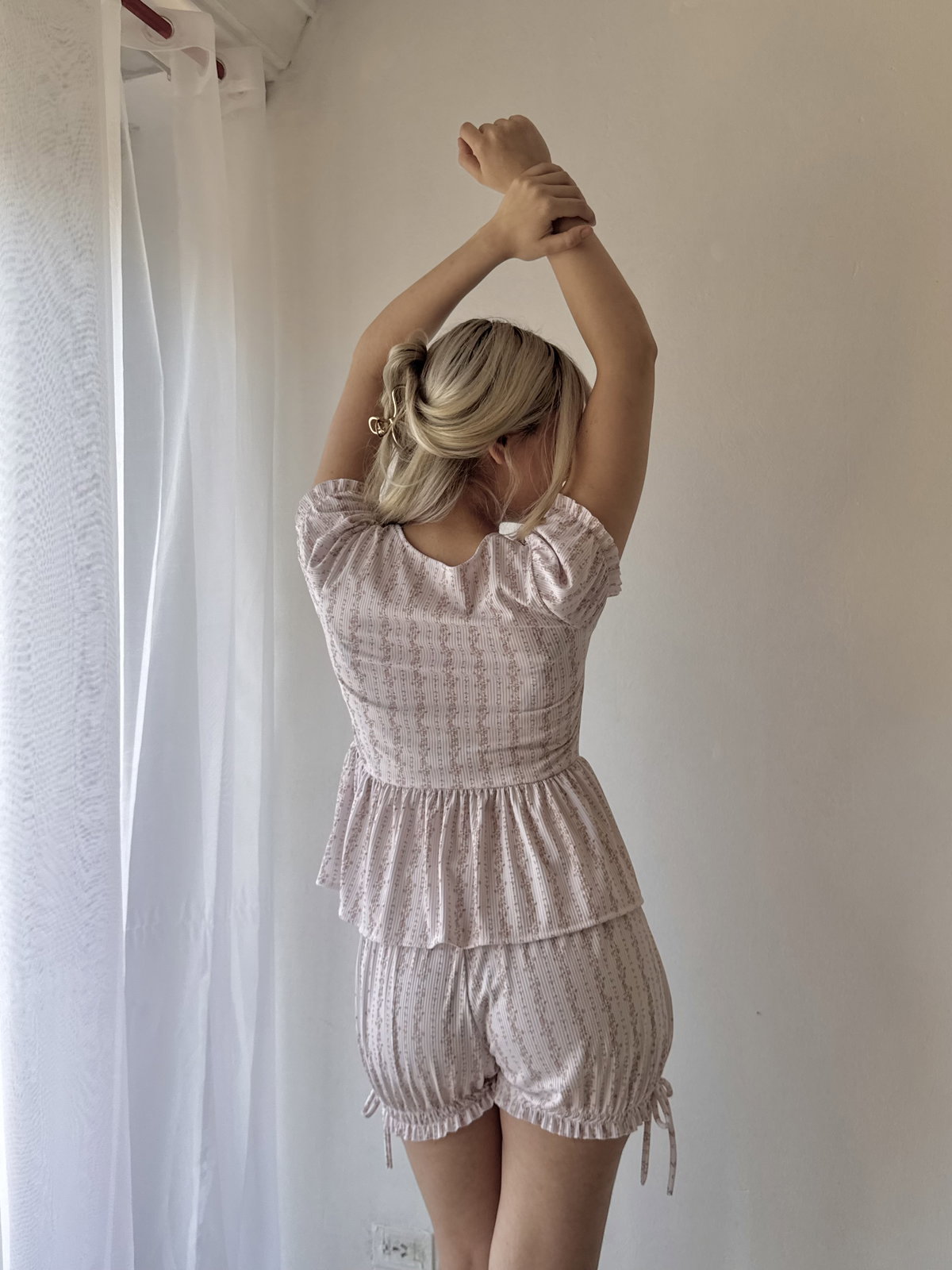 Bloomer o Short tiro medio-alto confeccionado en morley, tela suave y elastizada. Diseño inspirado en los bloomers victorianos, con un aire romántico y vintage.