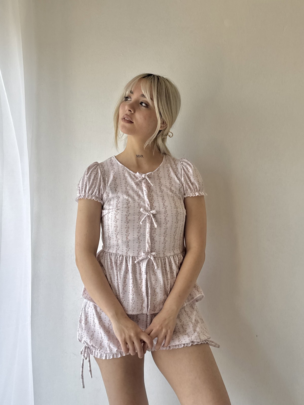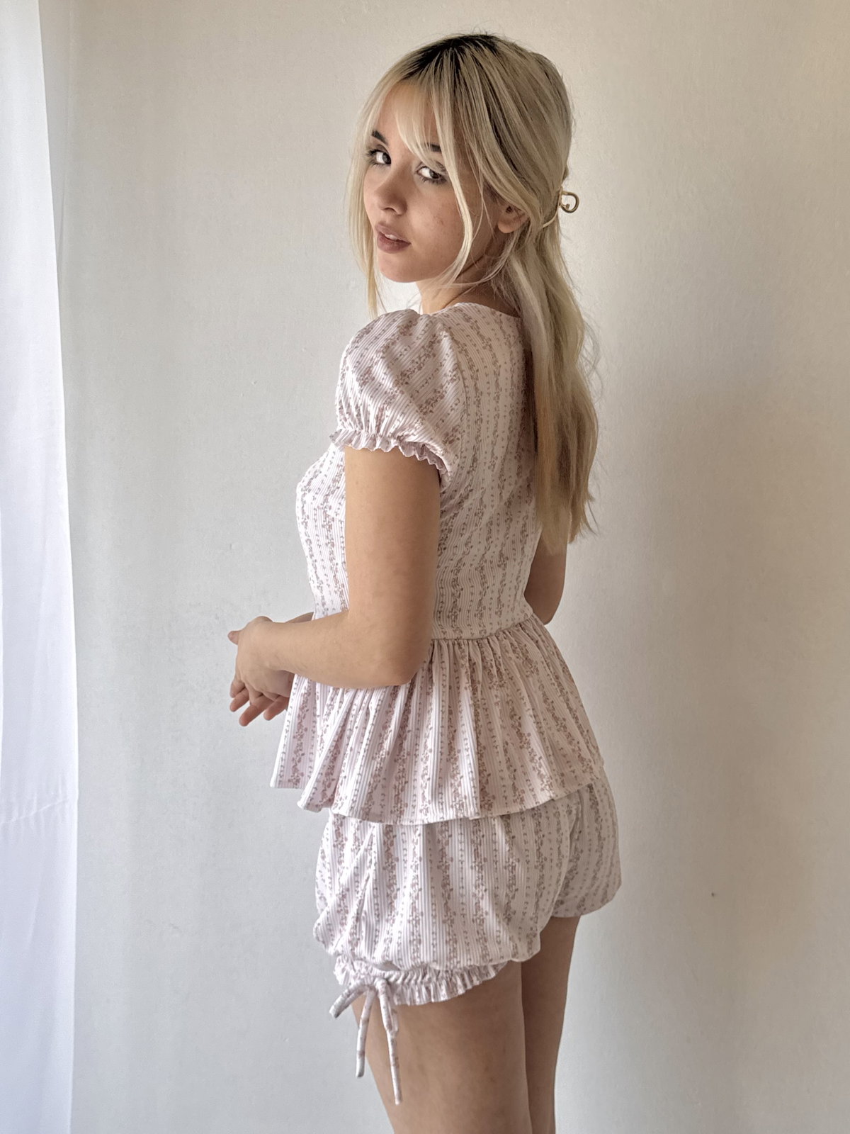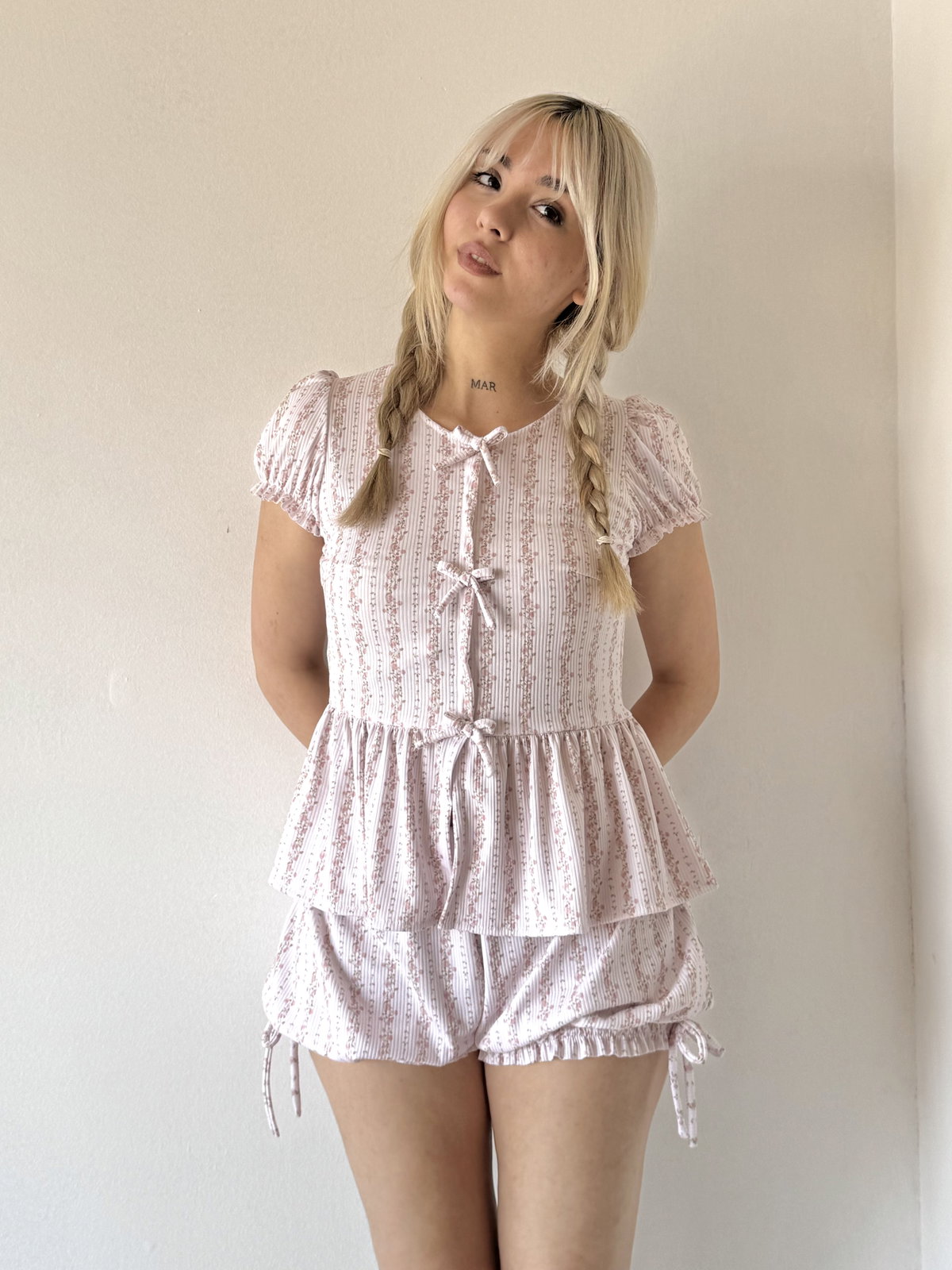 Bloomer o Short tiro medio-alto confeccionado en morley, tela suave y elastizada. Diseño inspirado en los bloomers victorianos, con un aire romántico y vintage.