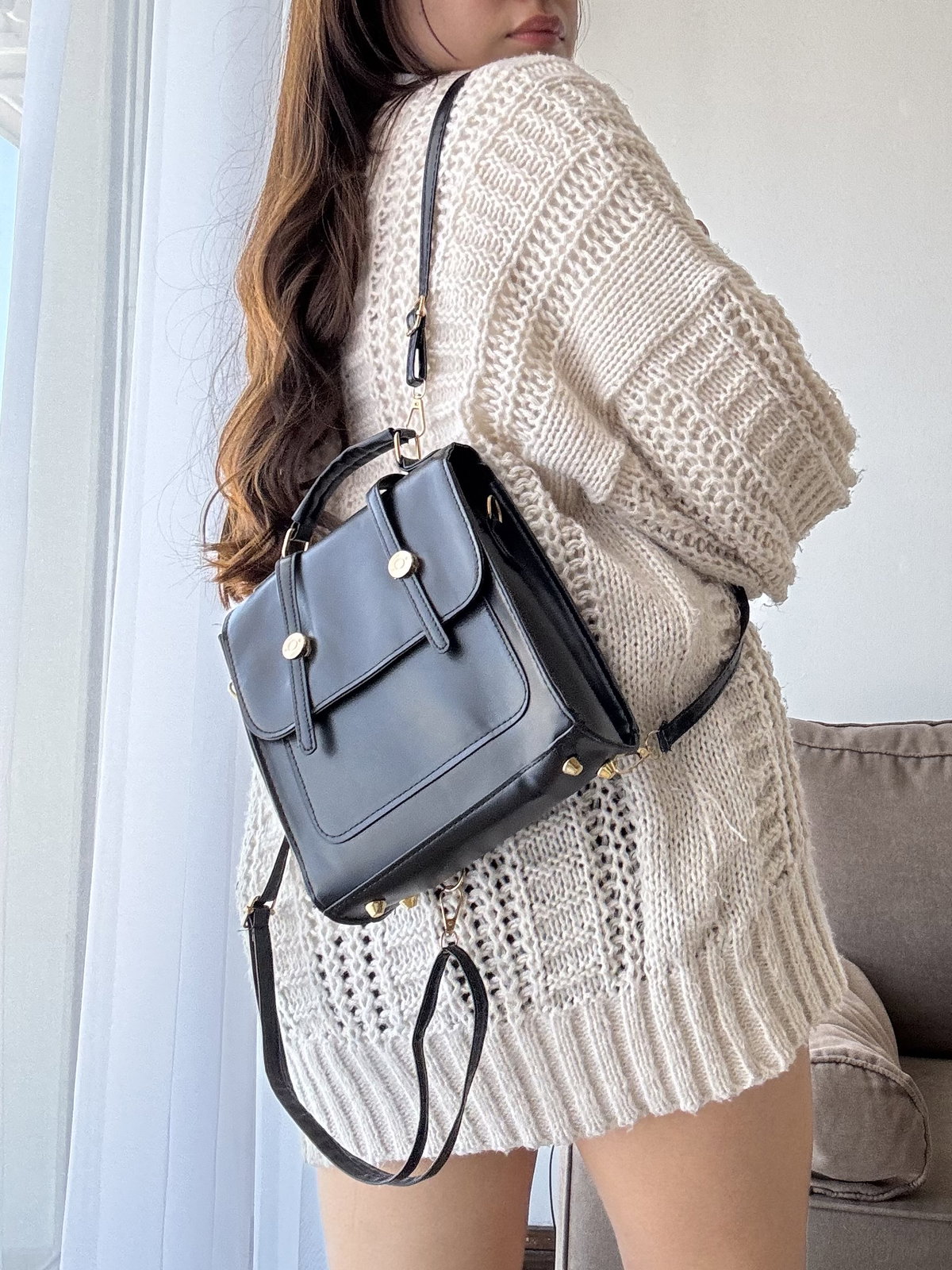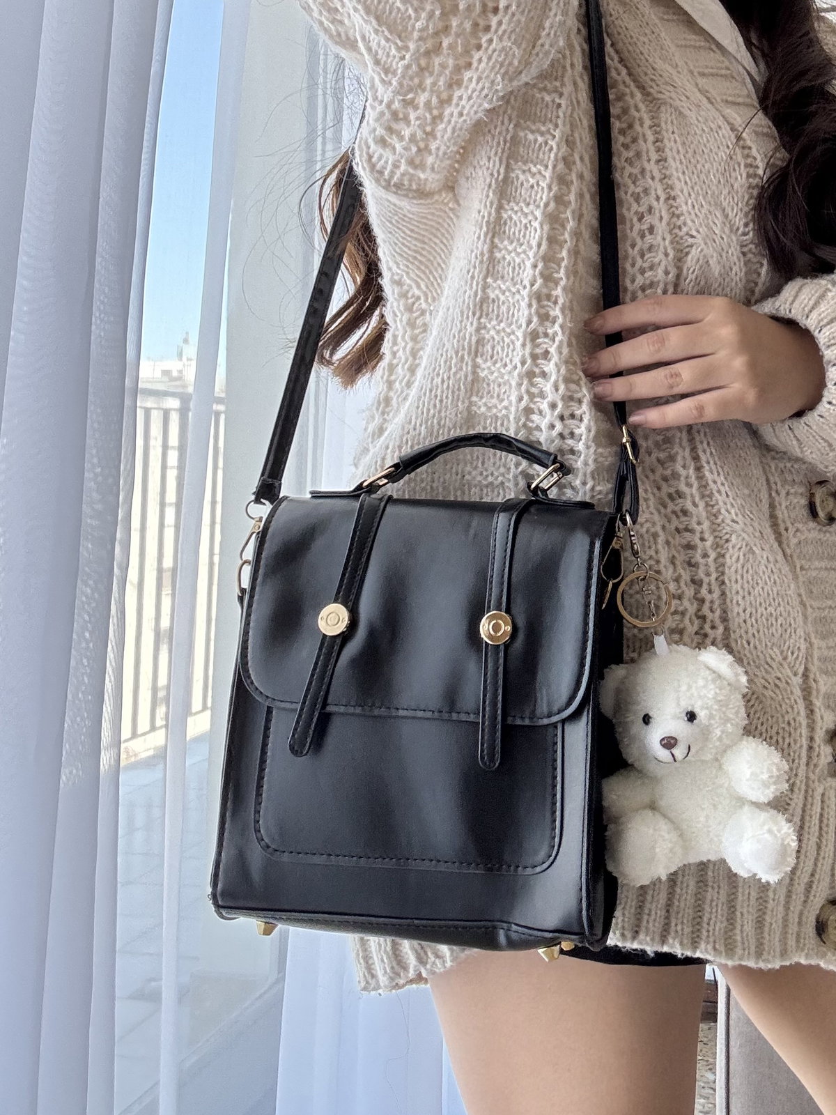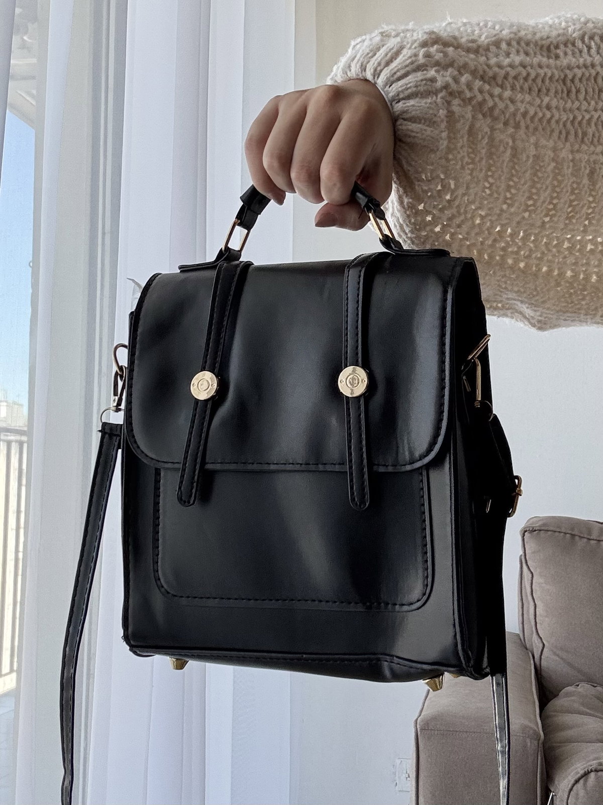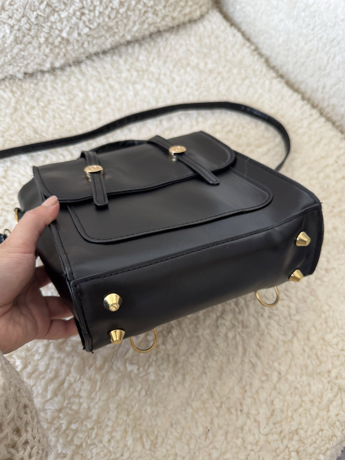 Cartera 2 en 1 con iman y herrajes metálicos. Cuenta con 1 bolsillo externo y no cuenta con forro interno. Incluye dos correas regulables e intercambiables, se puede usar como mochila y como morral, ideal para uso diario.