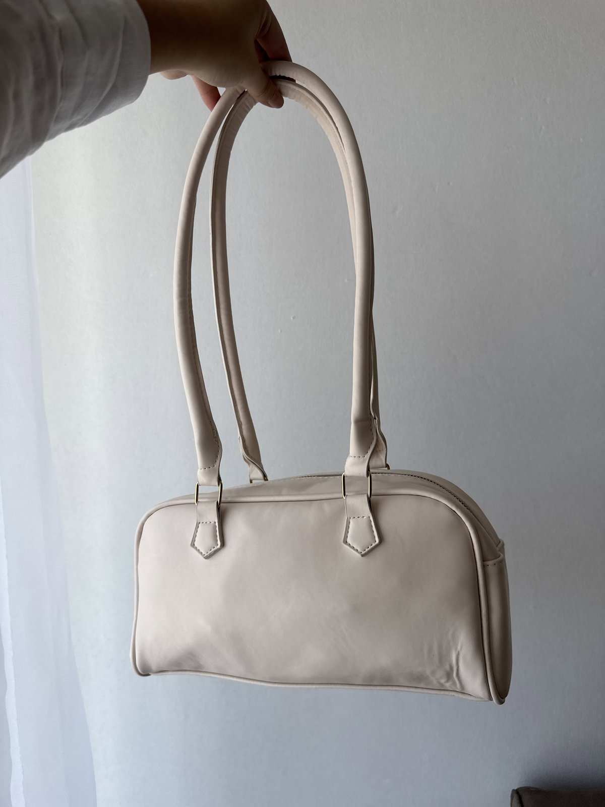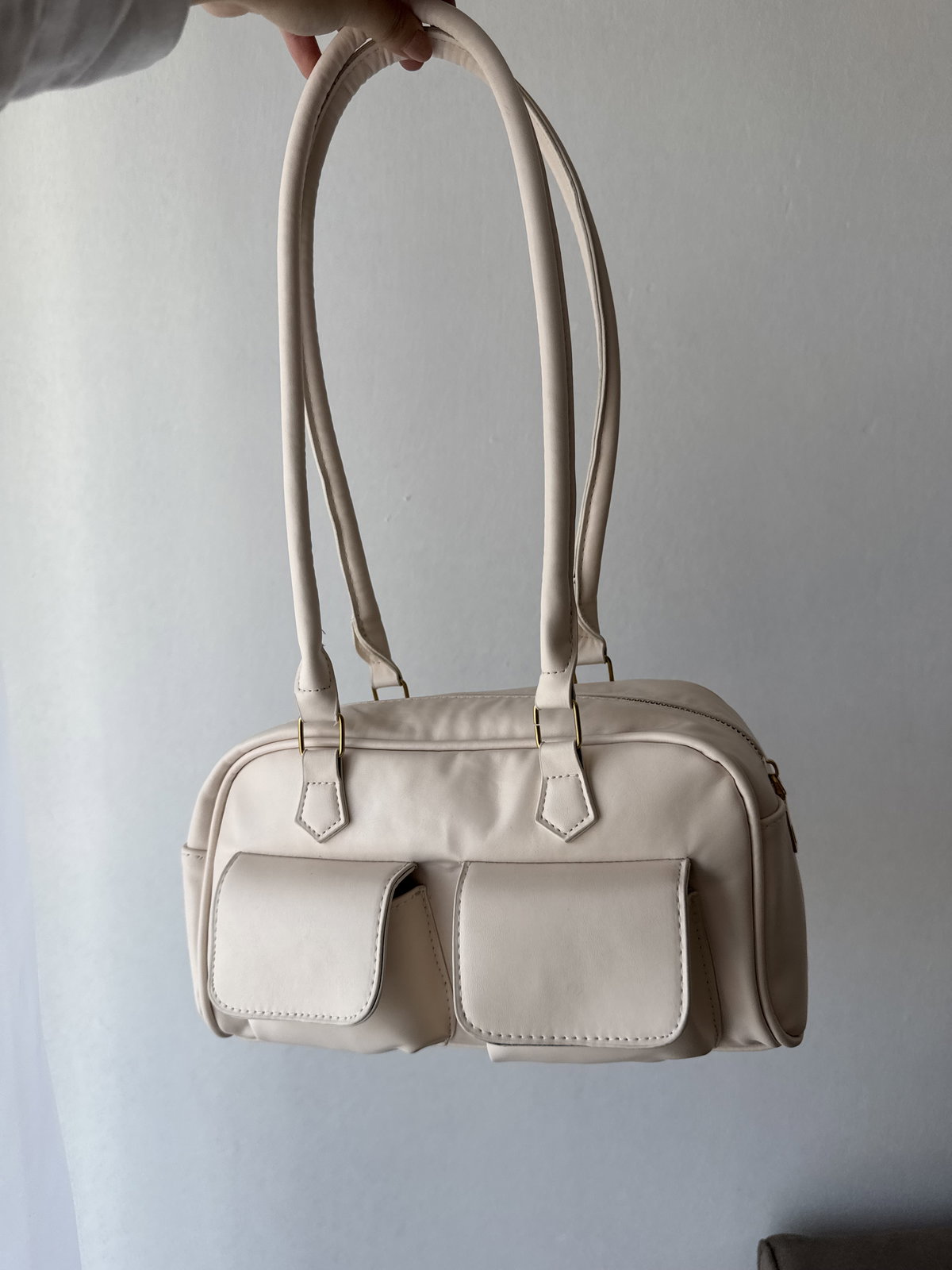 Cartera baguette de cuero sintético con cierre y herrajes metálicos. Cuenta con dos bolsillos externos y su interior no está forrado. Incluye tira al hombro no regulable, ideal para uso diario.