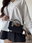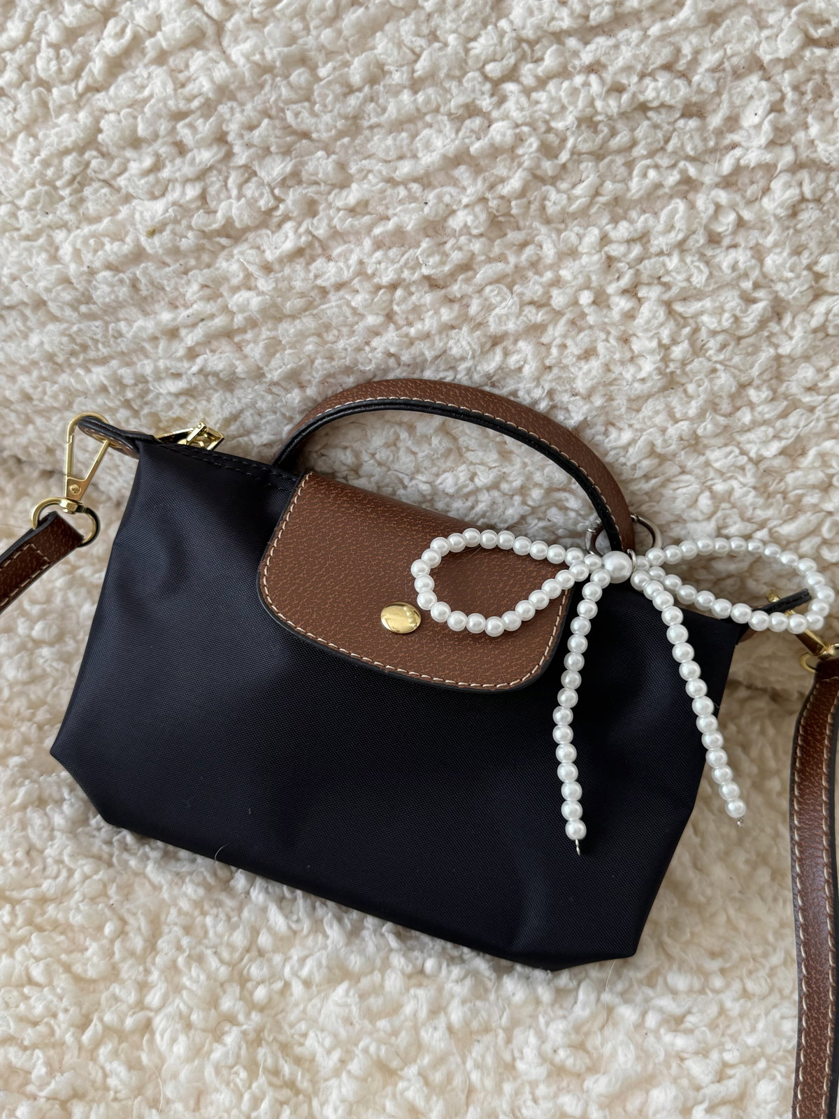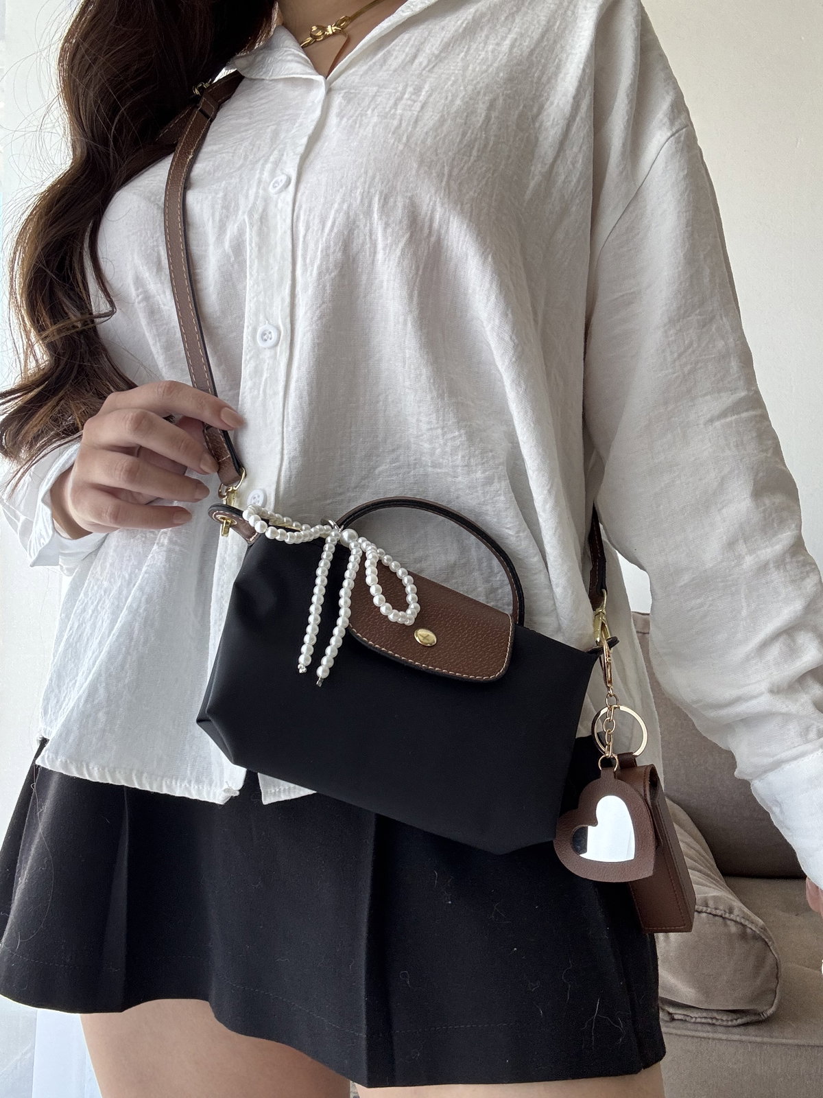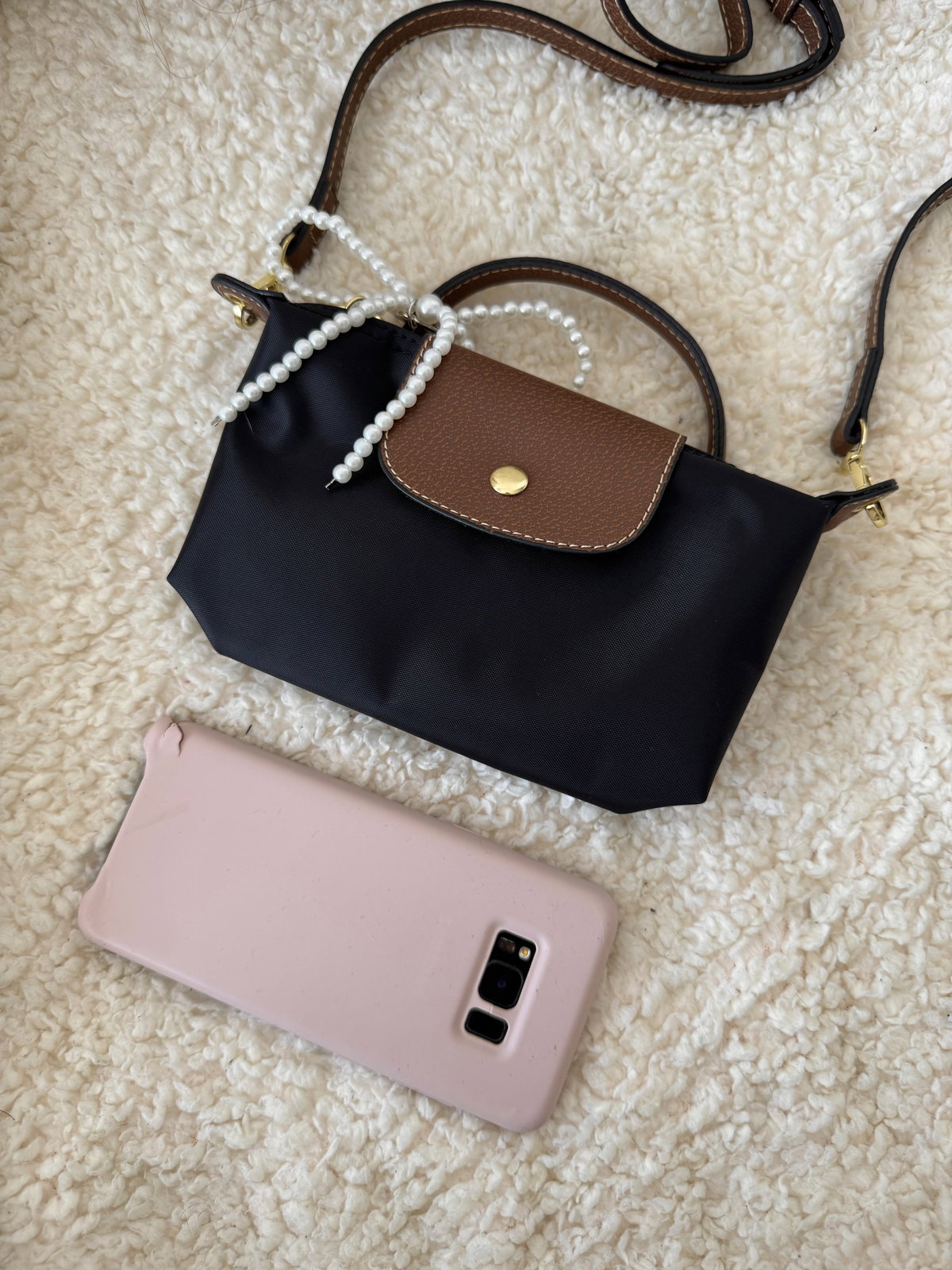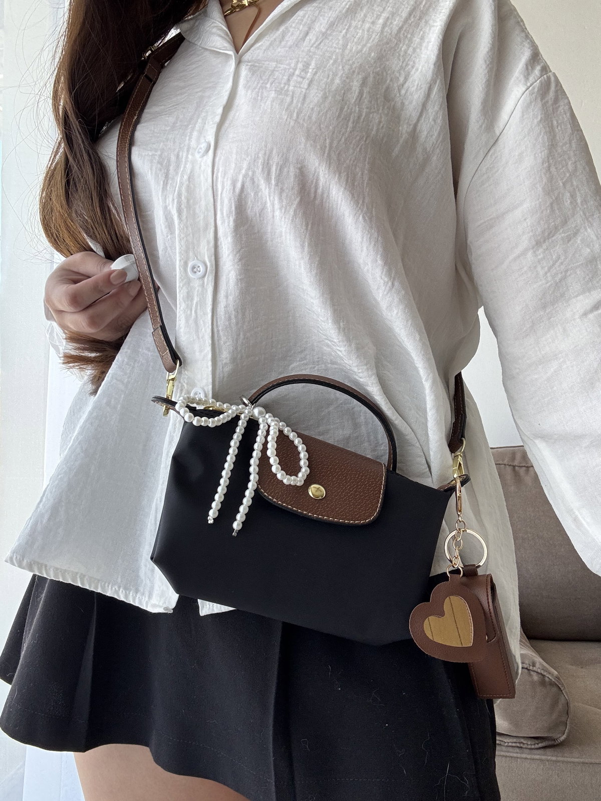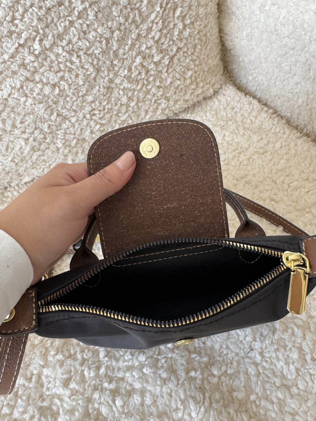 Mini bag de tela impermeable y detalles de cuero sintético con cierre y herrajes metálicos. No cuenta con forro. Incluye tira al hombro regulable, ideal para uso diario y llevar cosas escenciales.