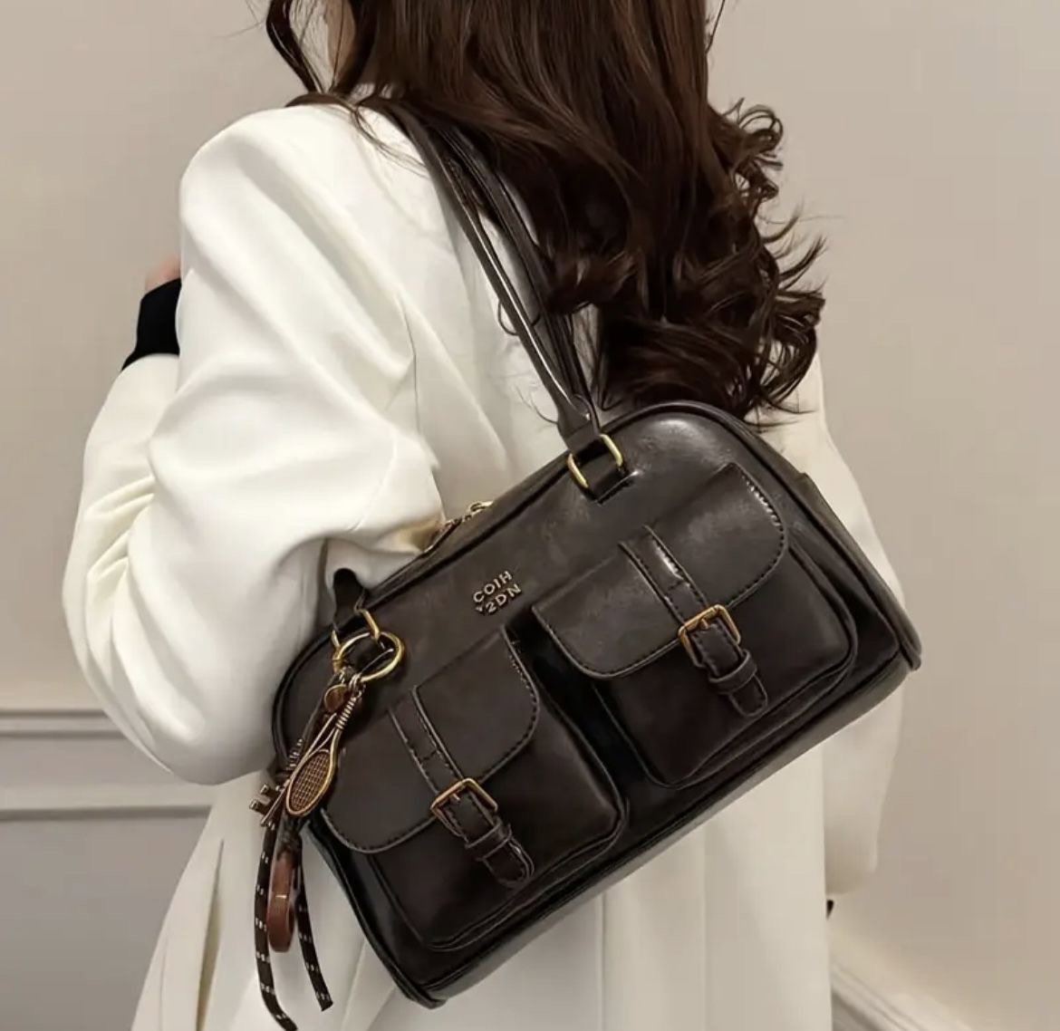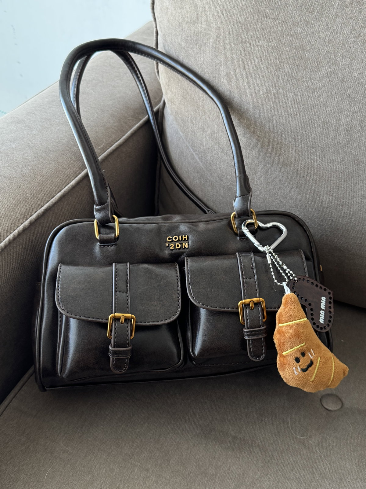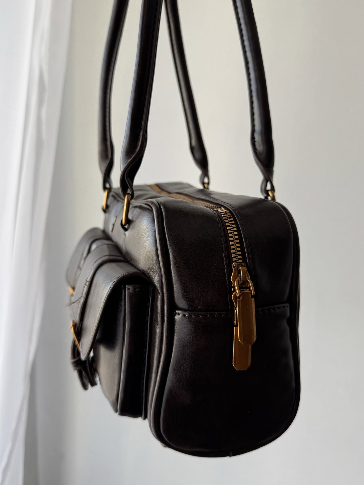 Cartera baguette de cuero sintético con cierre y herrajes metálicos. Cuenta con dos bolsillos externos y su interior no está forrado. Incluye tira al hombro no regulable, ideal para uso diario.