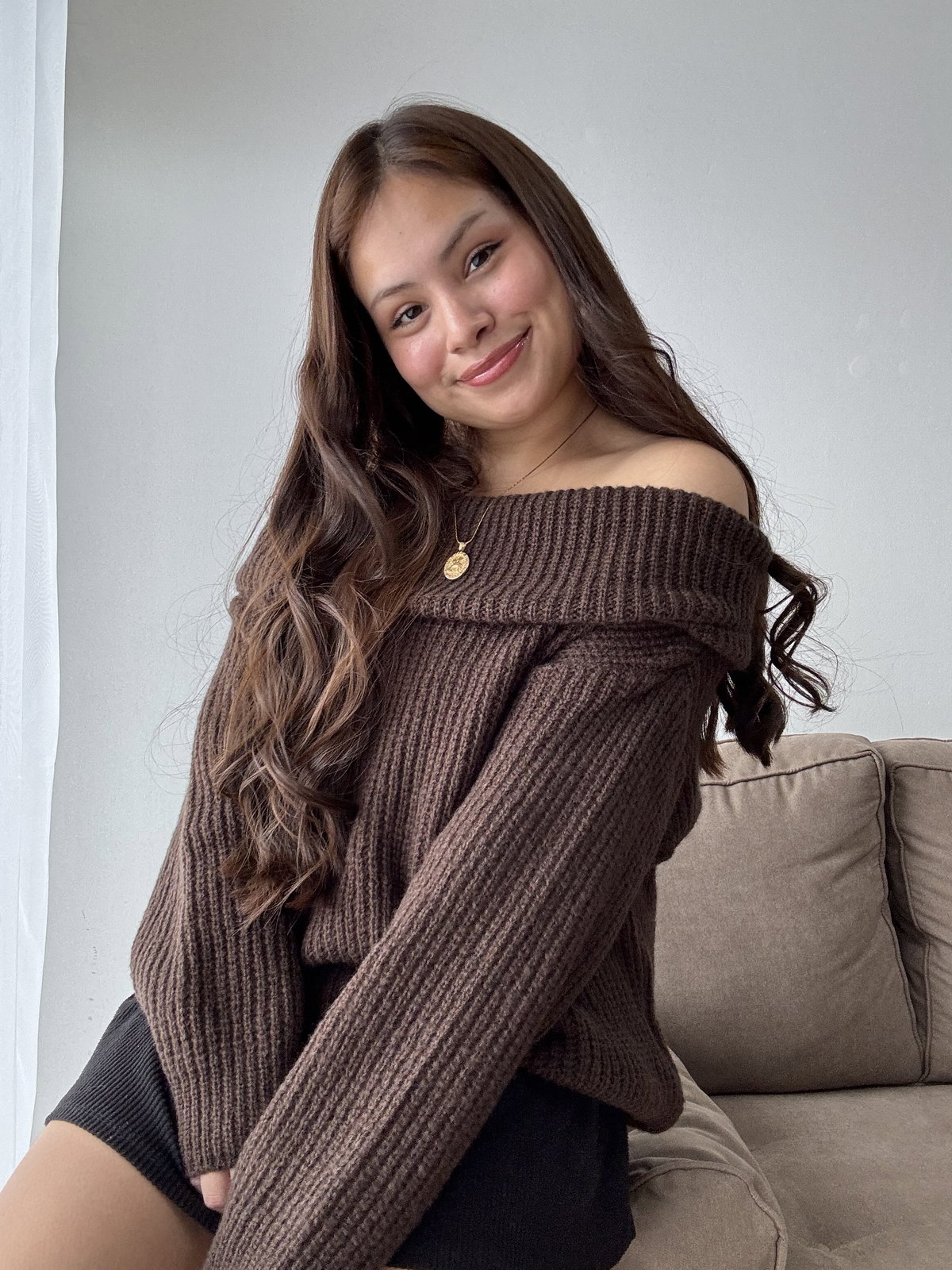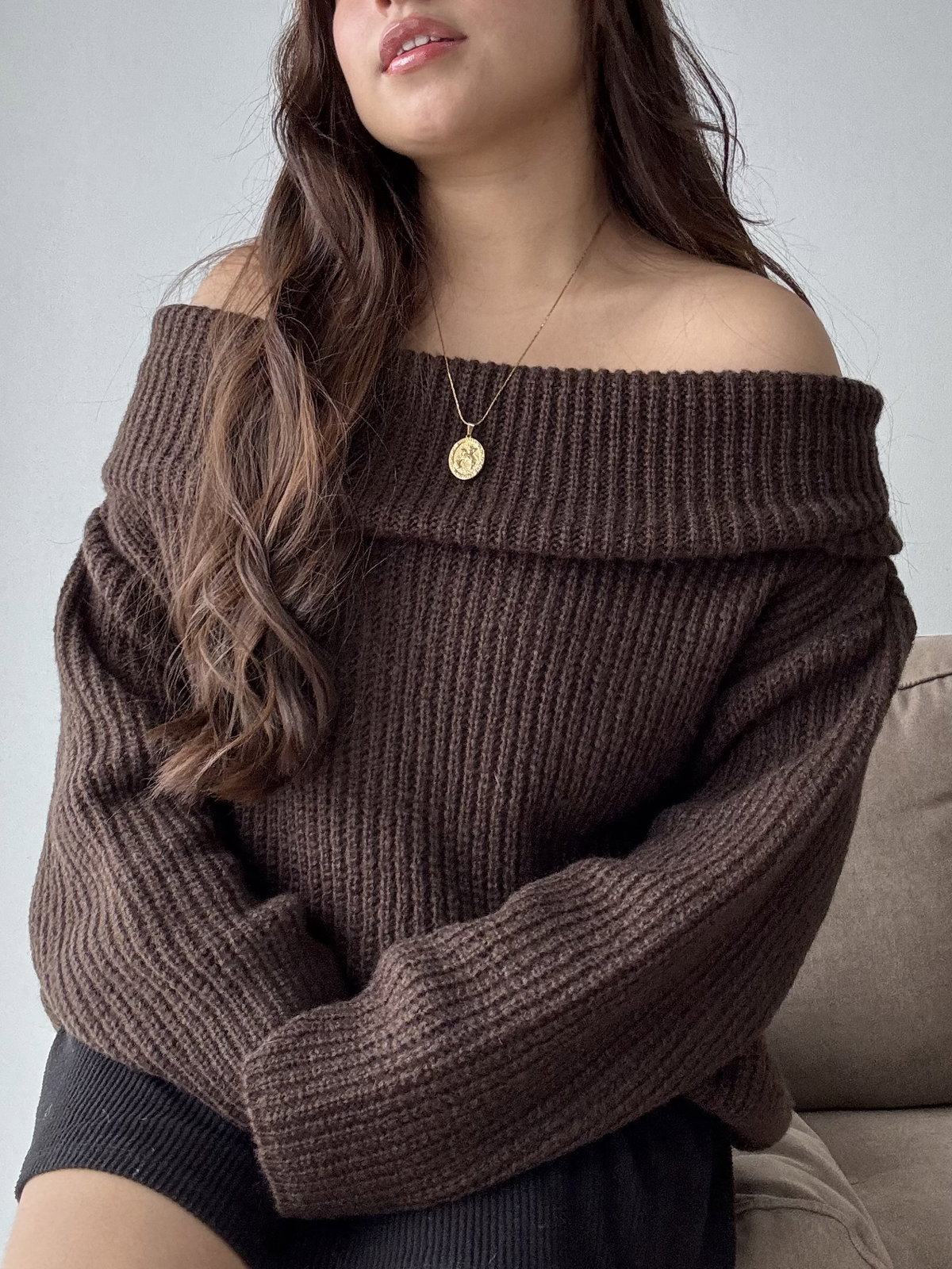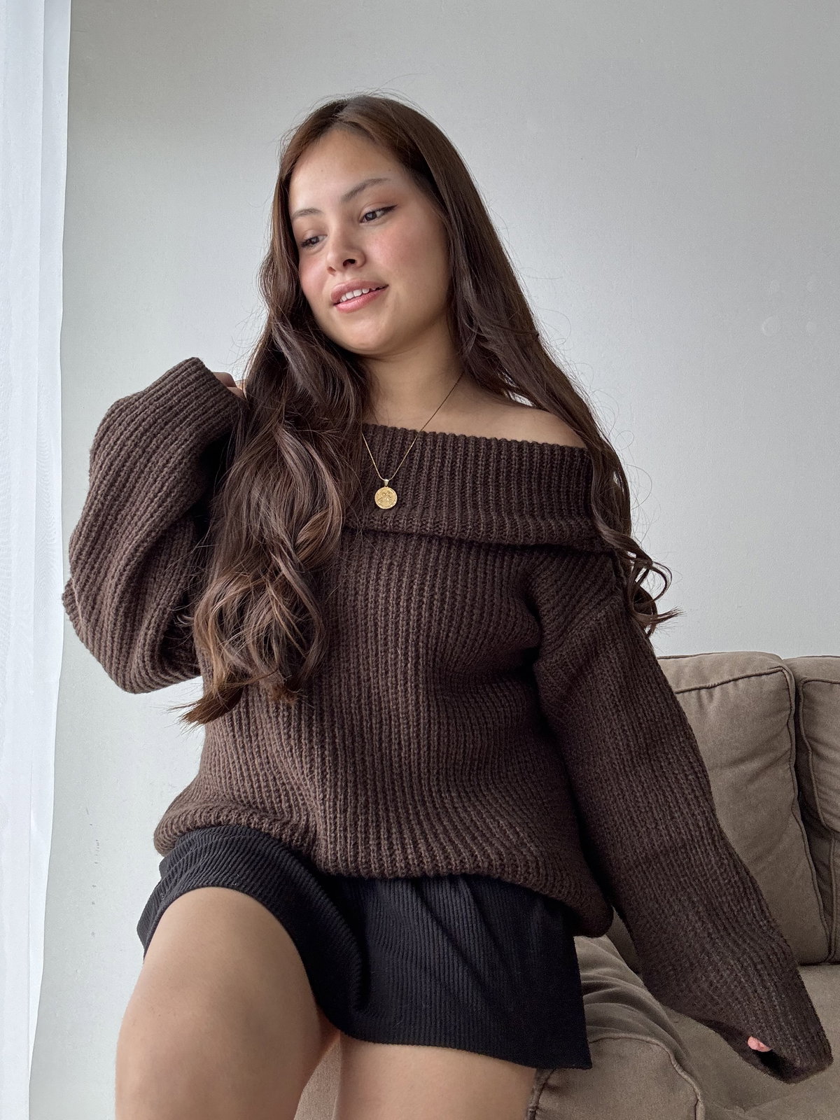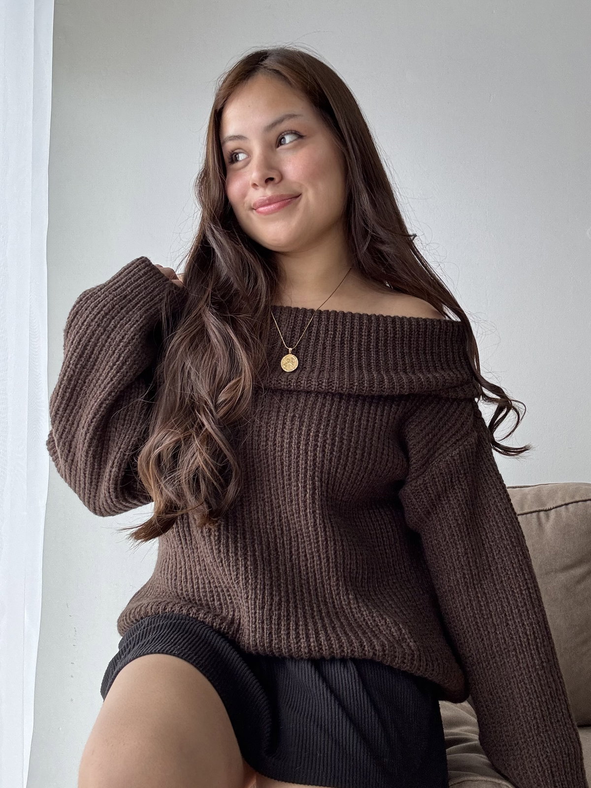 Sweater oversize off shoulder (hombros descubiertos) de lana Friss. Cuenta con elástico en la parte interior del cuello, para mayor comodidad.