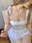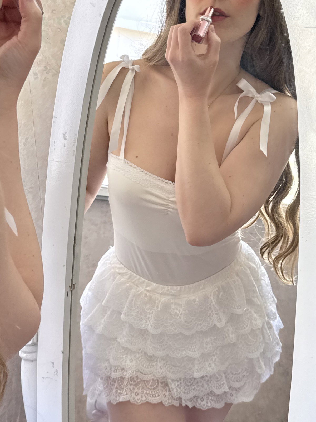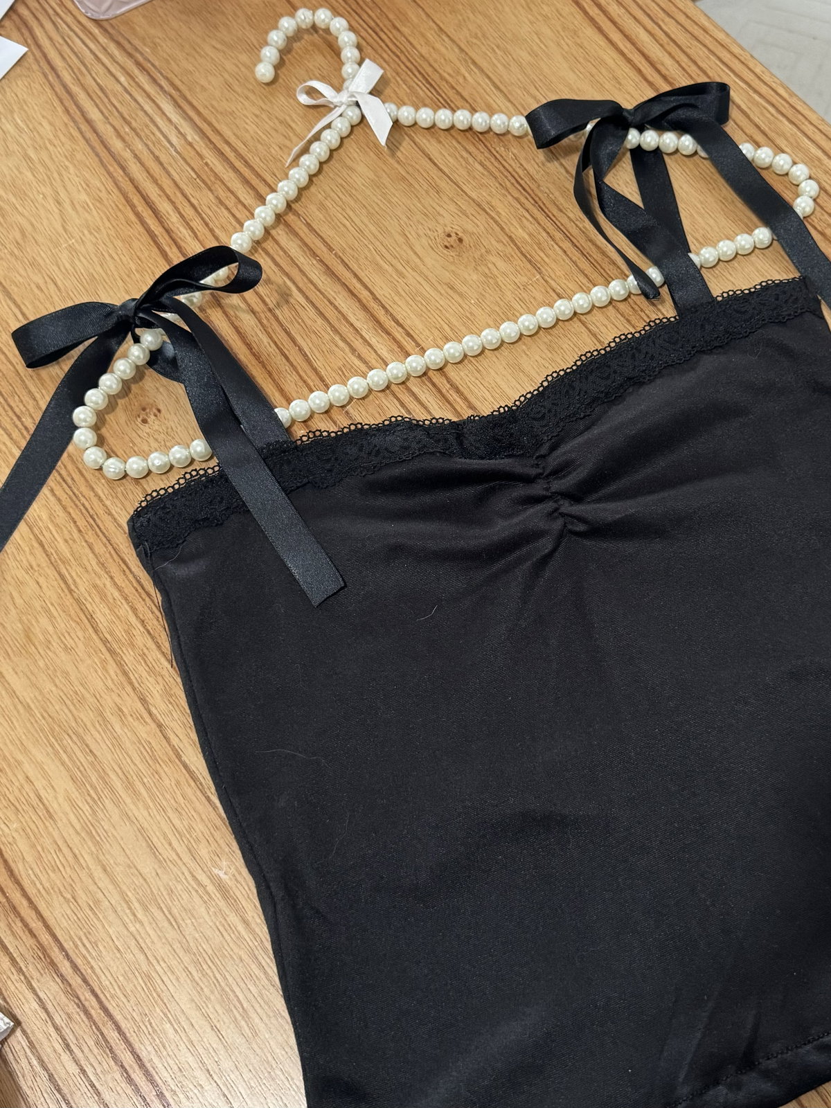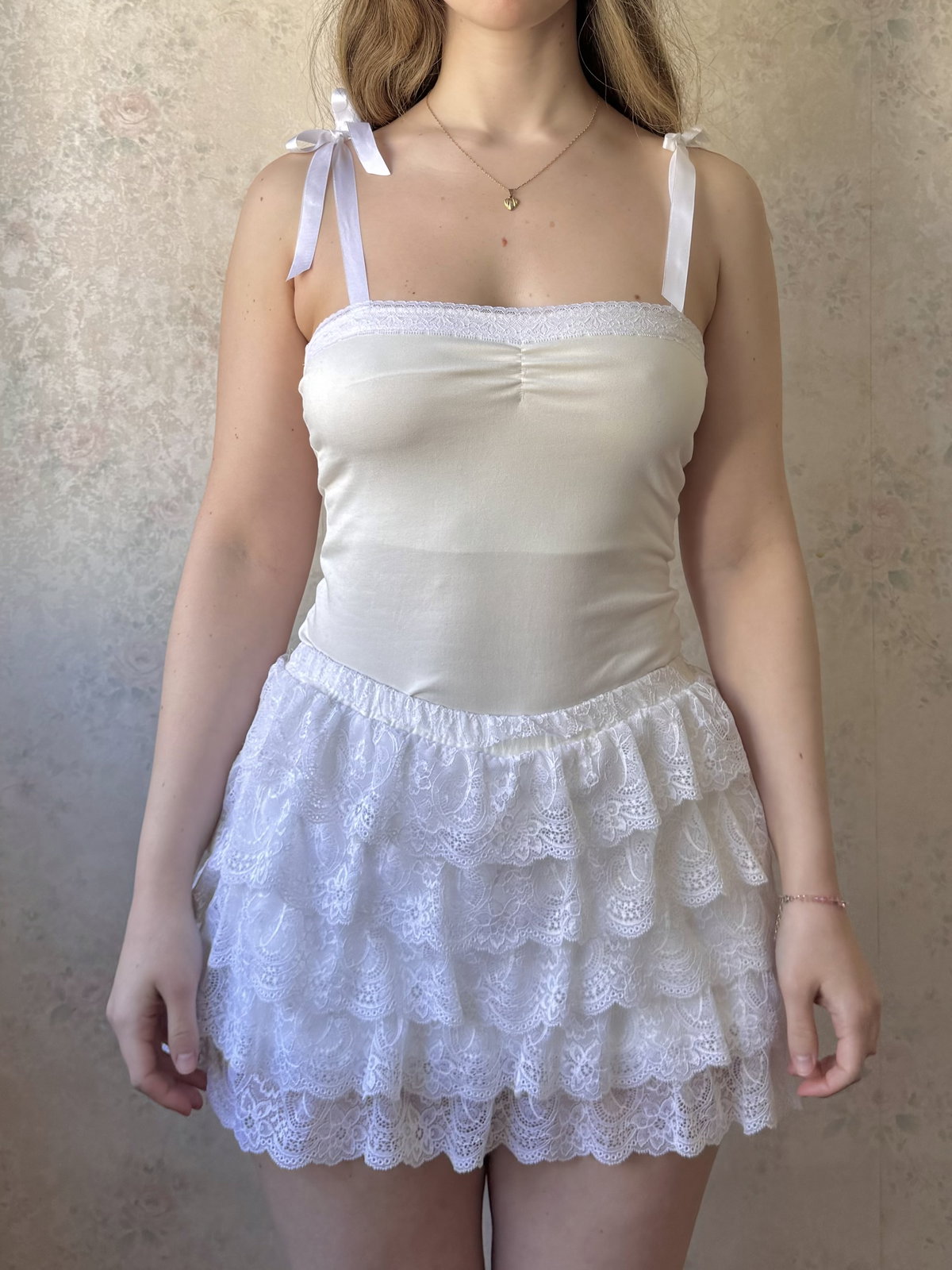 Top confeccionado en modal, elastizado y fresquito. En color blanco, breteles de cinta de raso ancho, sostén en la parte delantera, tiene doble tela, con puntilla en la parte superior y frunce en el medio.